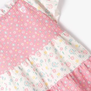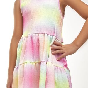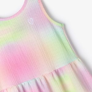 Strappy dress for little girls to keep them playing on hotter days without compromising on style. The dress features yellow straps and pink honeycomb. It has 3 ruffles in pink, blue and yellow, giving it the perfect length for the little ones’ comfort. Dress with ruffles Pink, blue and yellow