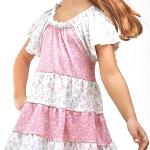 Discover the joy of warm days in the most comfortable, fun and floral way. This floral dress has ruffles in different colours printed with flowers reminiscent of spring. It has a round neck with a rubberised finish and short sleeves for freshness. Ruffle dress Flower print White and pink colours