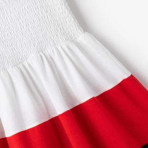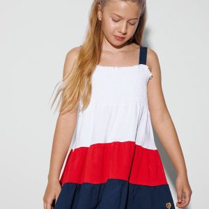 Strappy dress so little ones can keep playing on warmer days without compromising on style. The white dress features wide navy blue straps and white honeycomb. It has 3 ruffles in white, red and blue, giving it the perfect length for the little ones’ comfort. Dress with ruffles White, navy