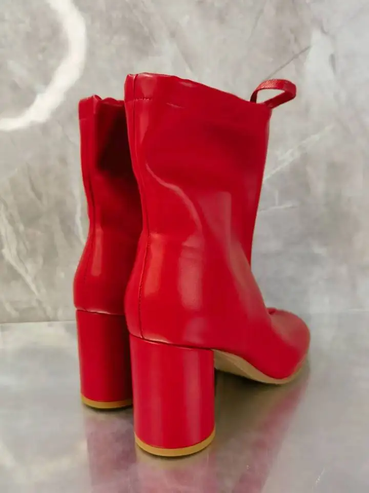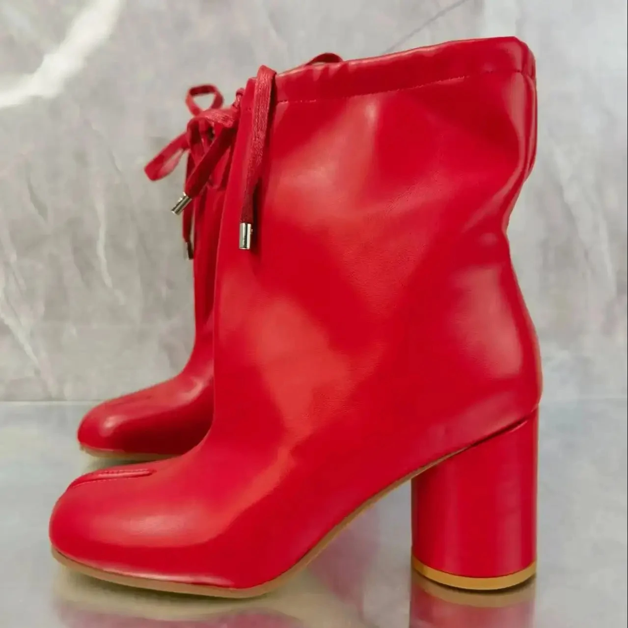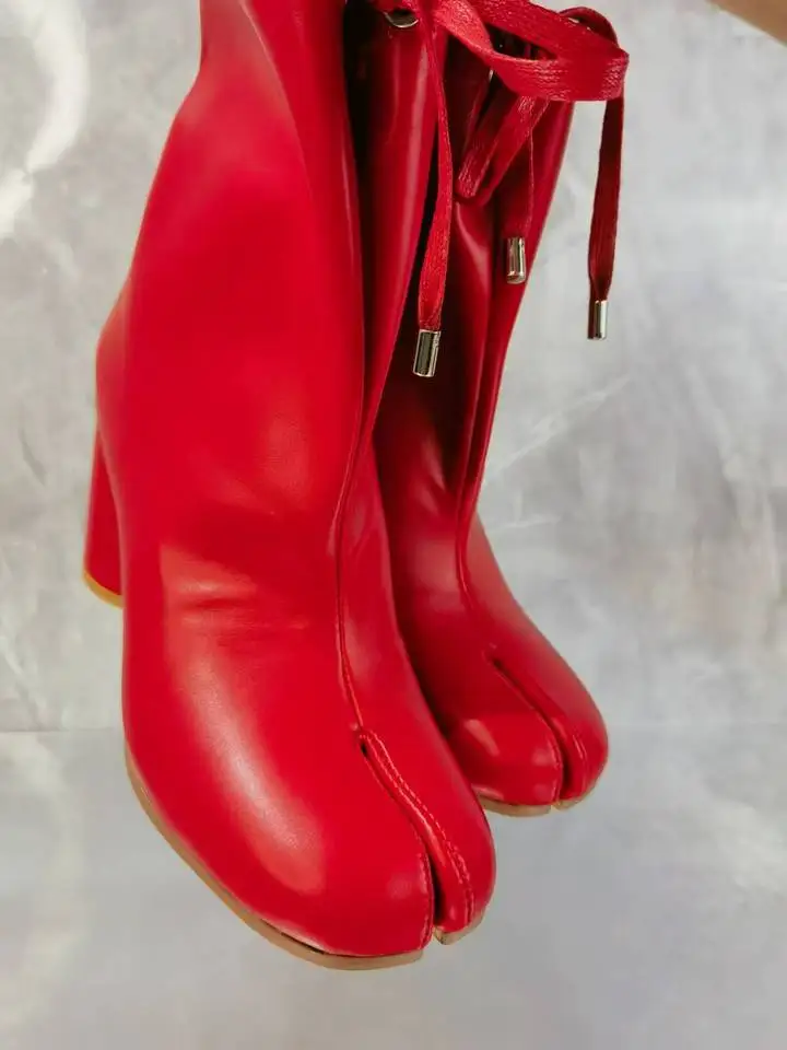 2025 Trendy Red Solid Color Women’s High Heel Lace-Up Tabi Split Toe Short Boots DE Leather Winter Shoes for Women