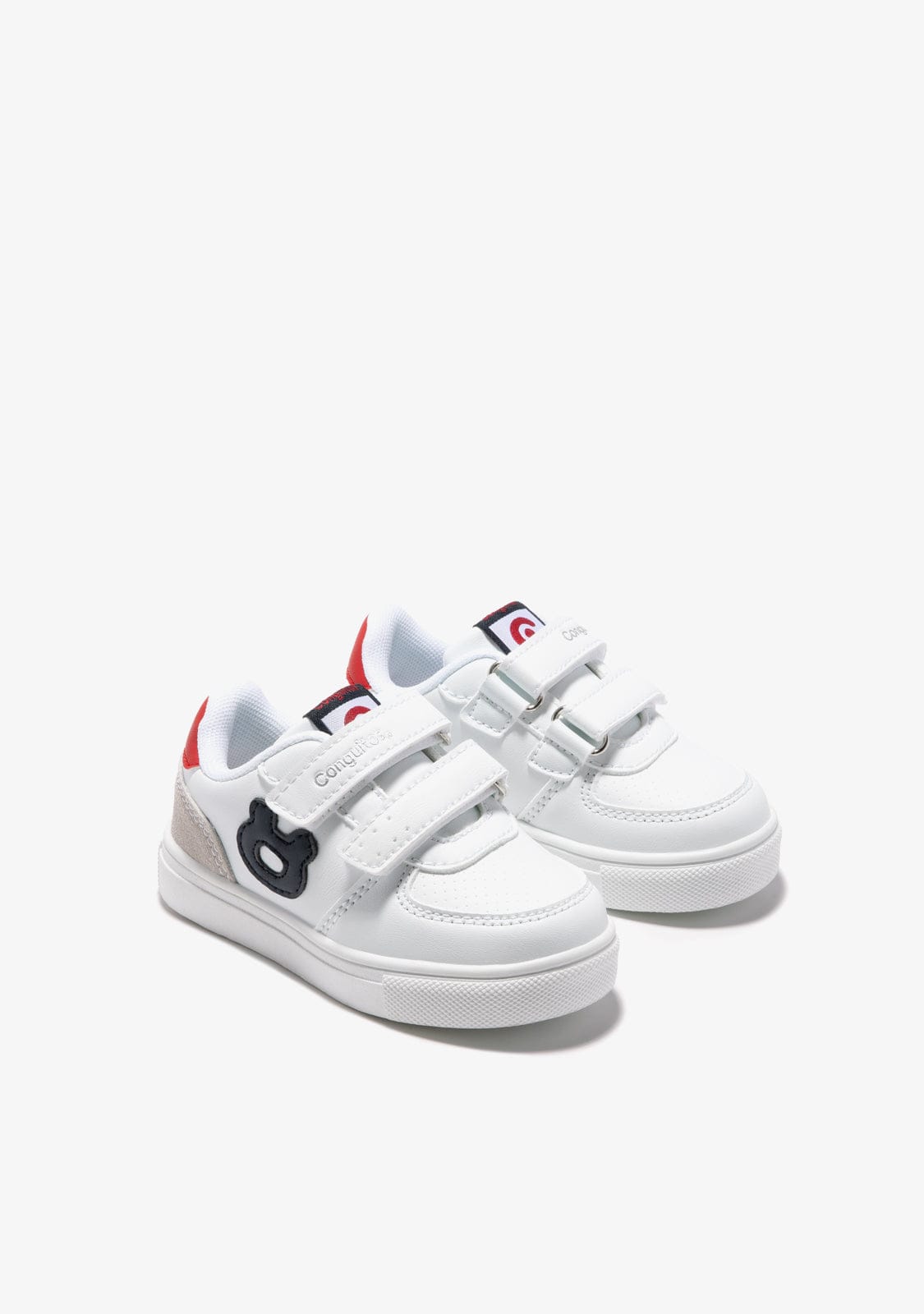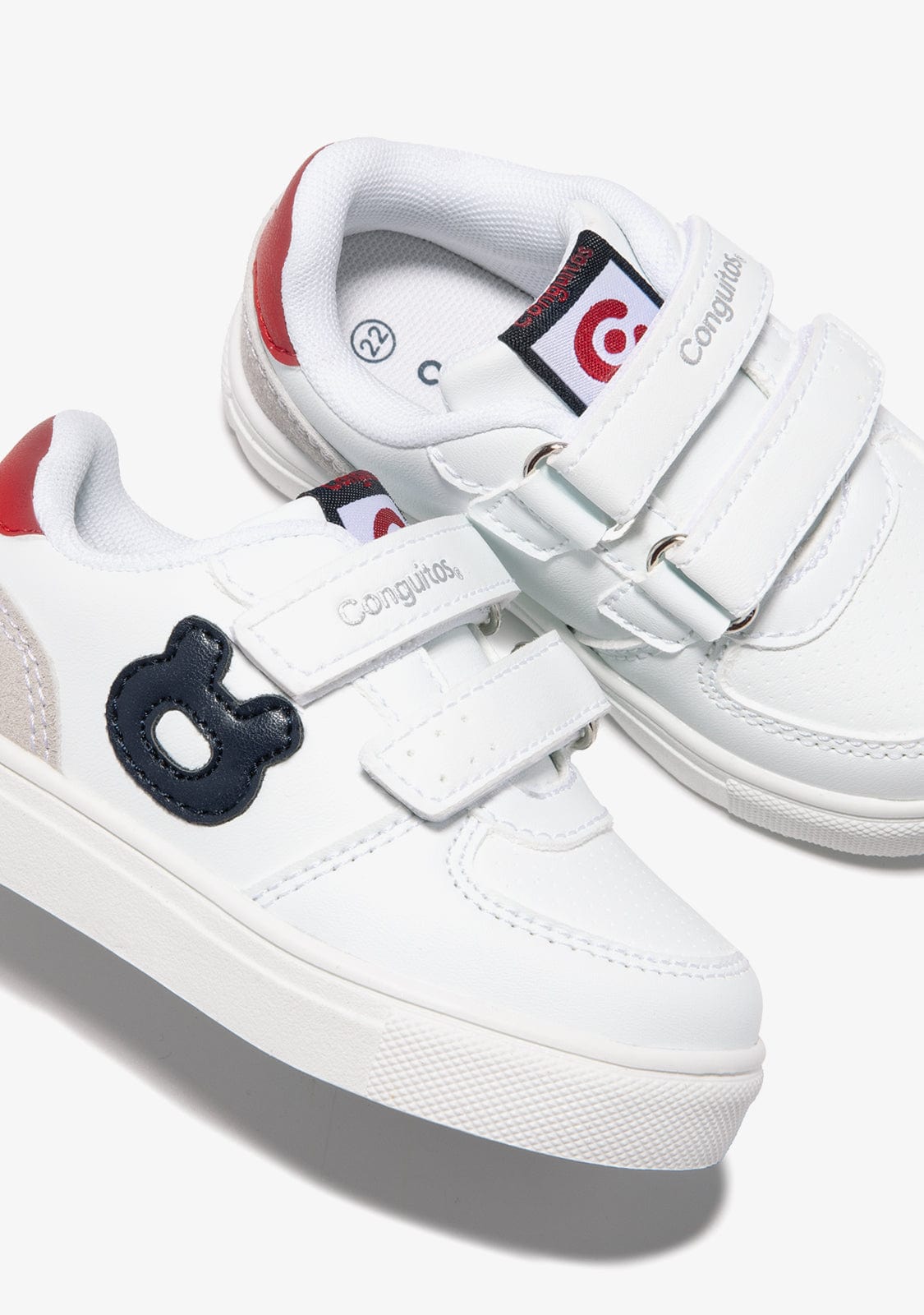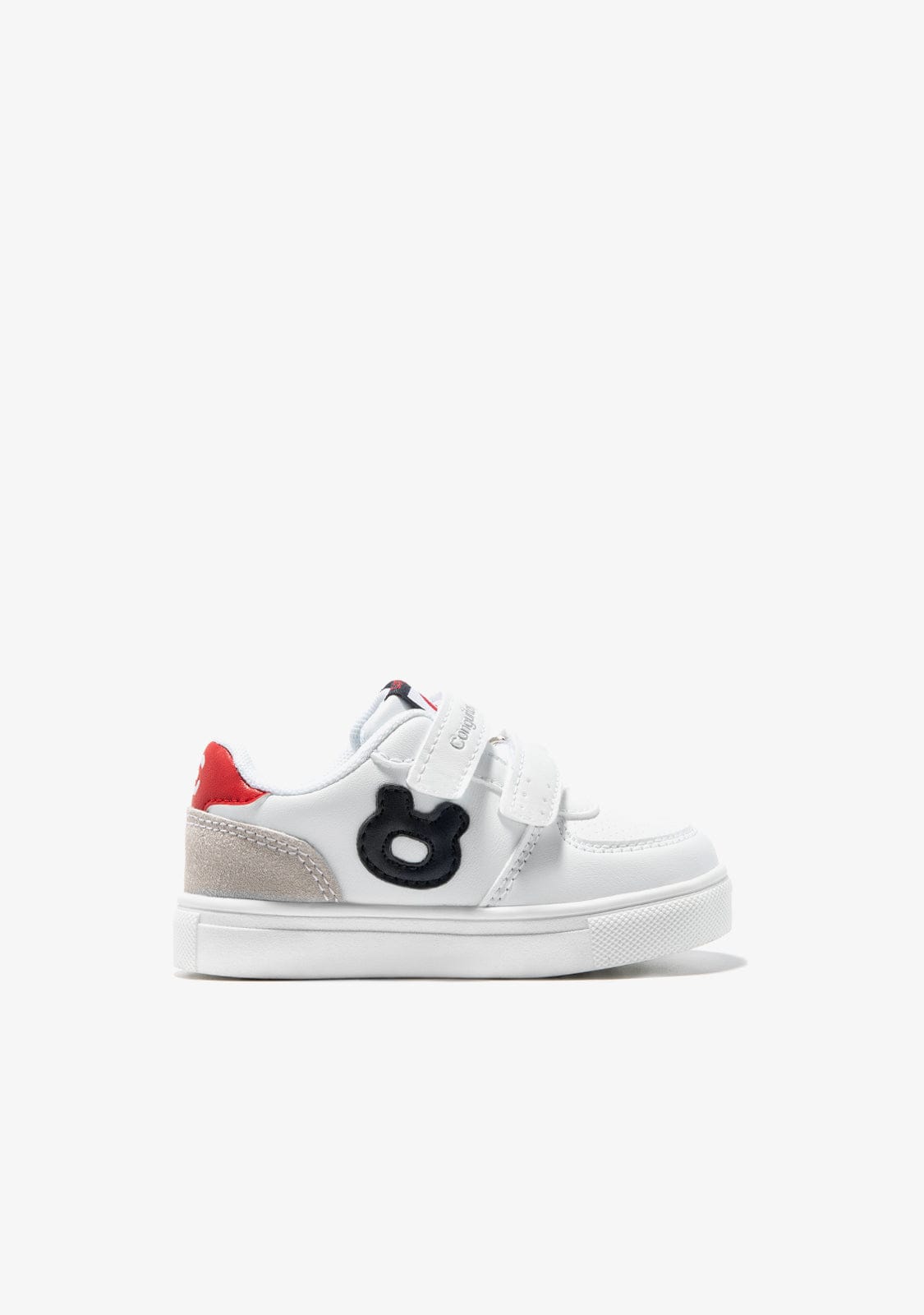 This design combines the white micronapa with a red detail on the heel. They fasten with adhesive straps, making them easy to put on and take off, perfect for everyday wear.