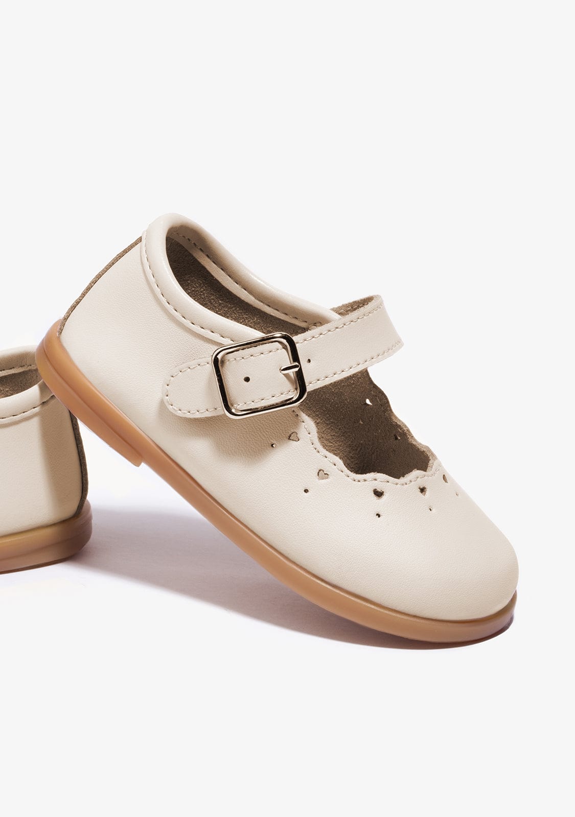 These ballerina have an ankle strap and buckle fastening for extra foot support. They are decorated with die-cut hearts and circles around the edge. They are made in Spain.