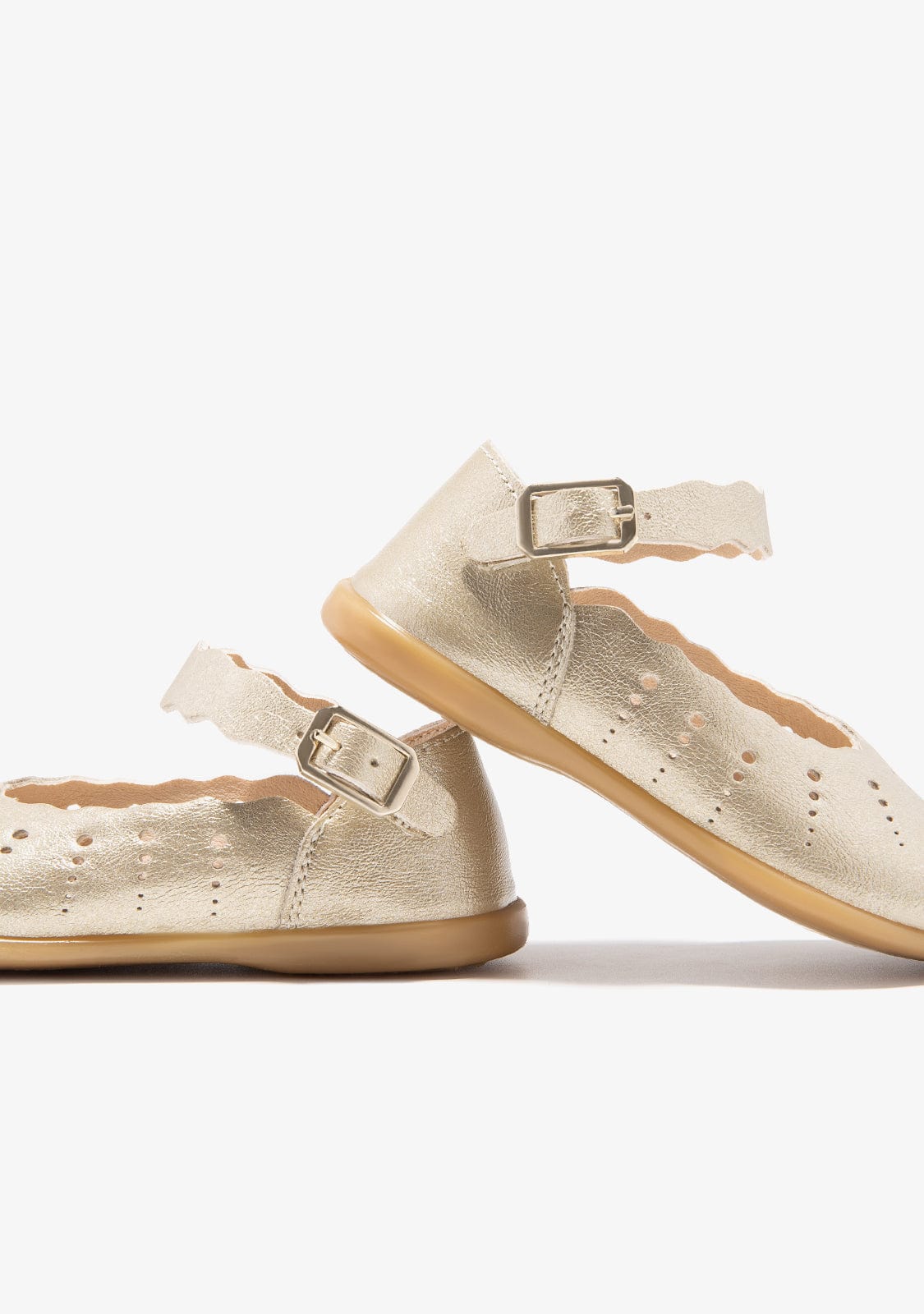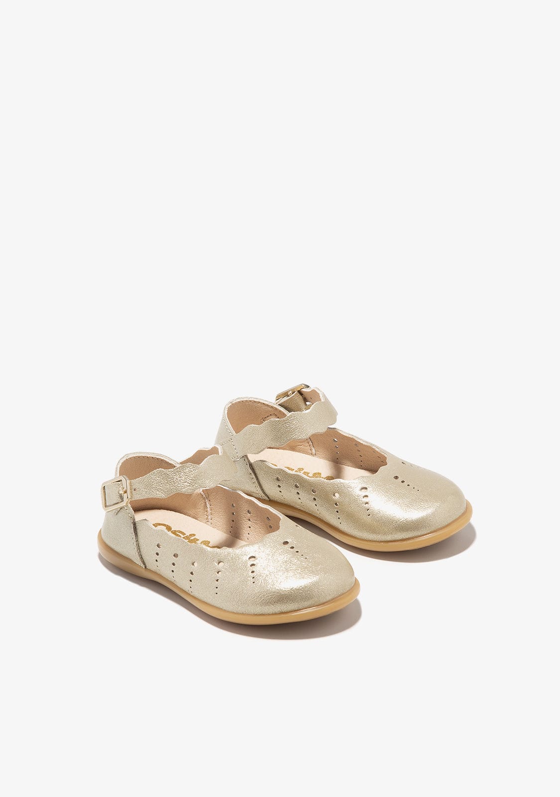 Gold ballerina with ankle strap and buckle fastening. They are decorated with waves on the rim and a die-cut circle around the edge. They are made in Spain.