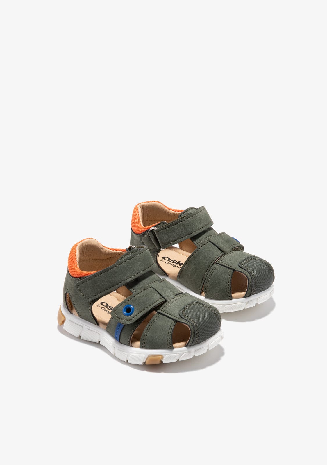 This model of strappy sandals has adjustable and adherent straps at the front for greater comfort. They are decorated with blue, orange and white touches.