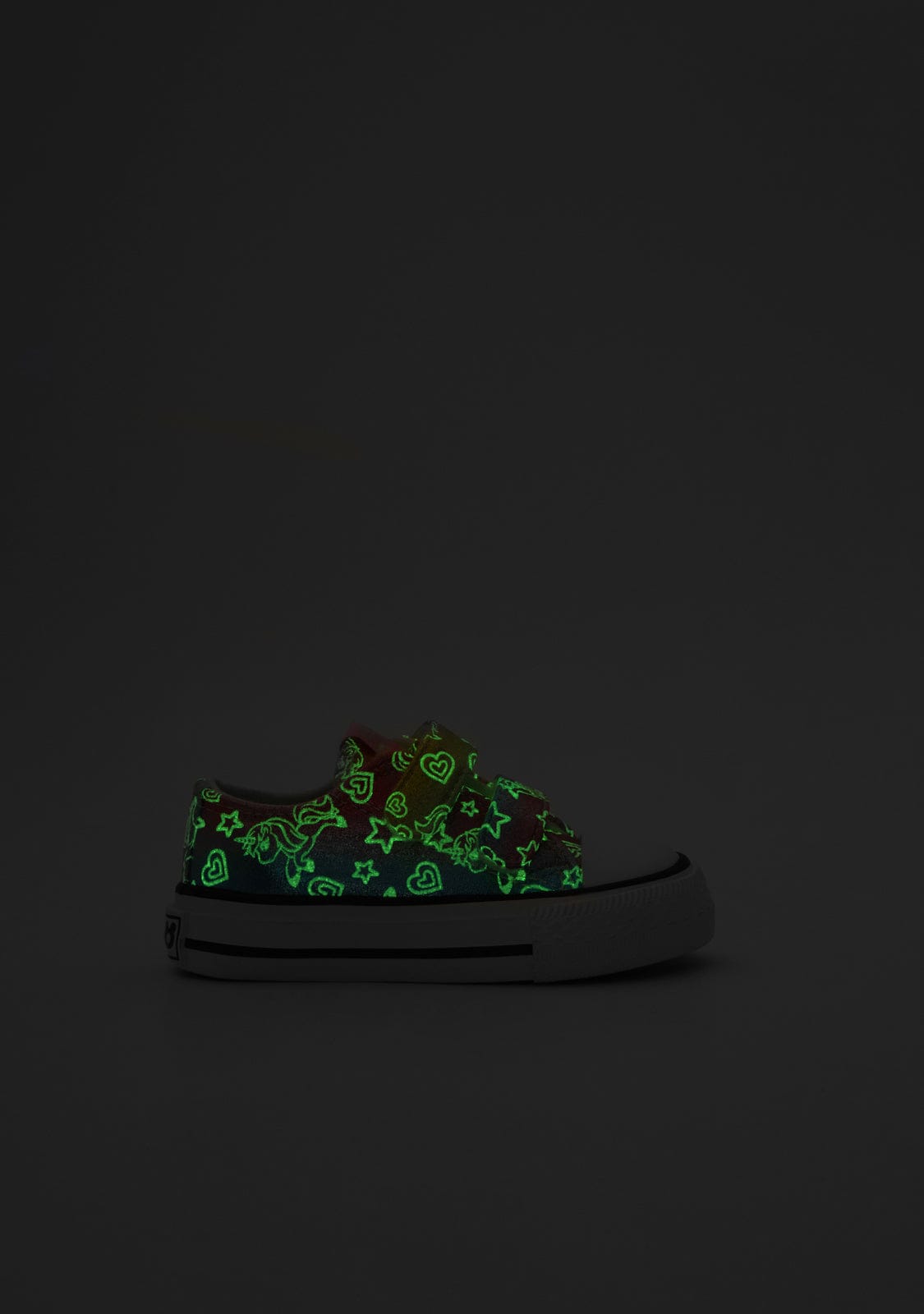 This multicoloured model is decorated with unicorn, heart and star prints that glow in the dark. It features our emblem on the heel. Easy on and easy off straps.