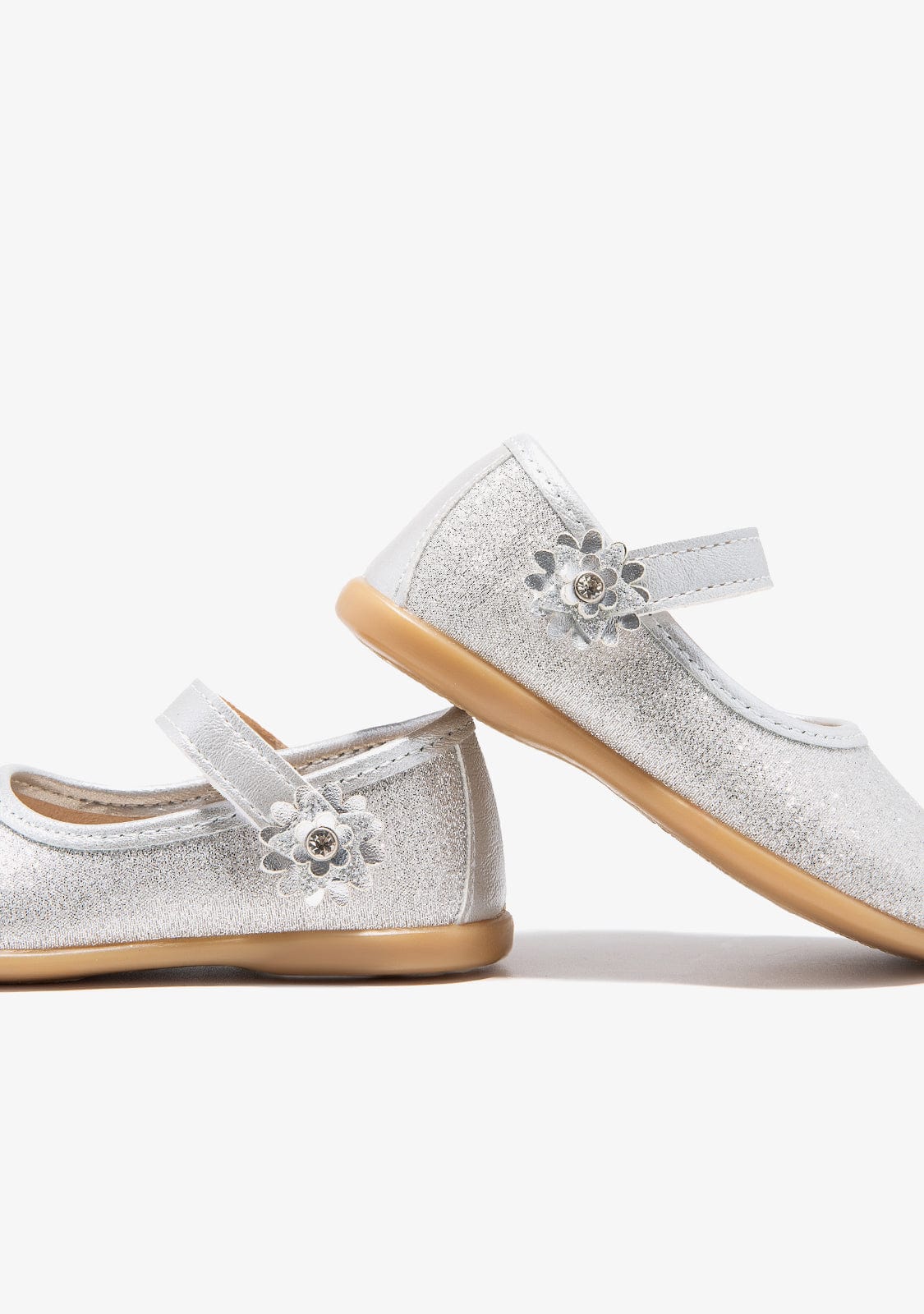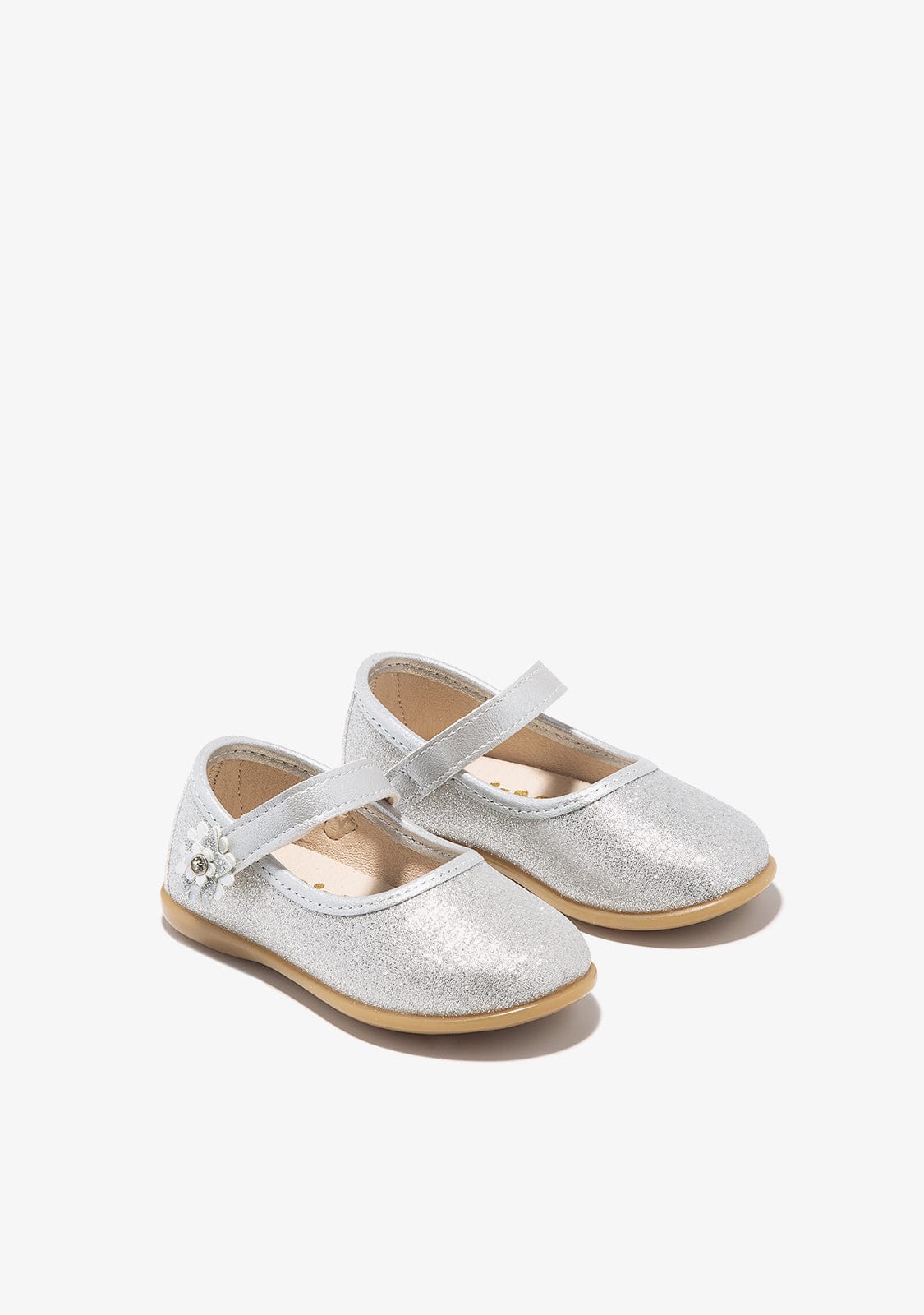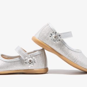 These silver glitter ballerina have a strap that improves the fit of the foot. They also have a star and flower decoration on the fastening strap. They have a silver trim on the edge of the shoe. They are made in Spain.
