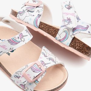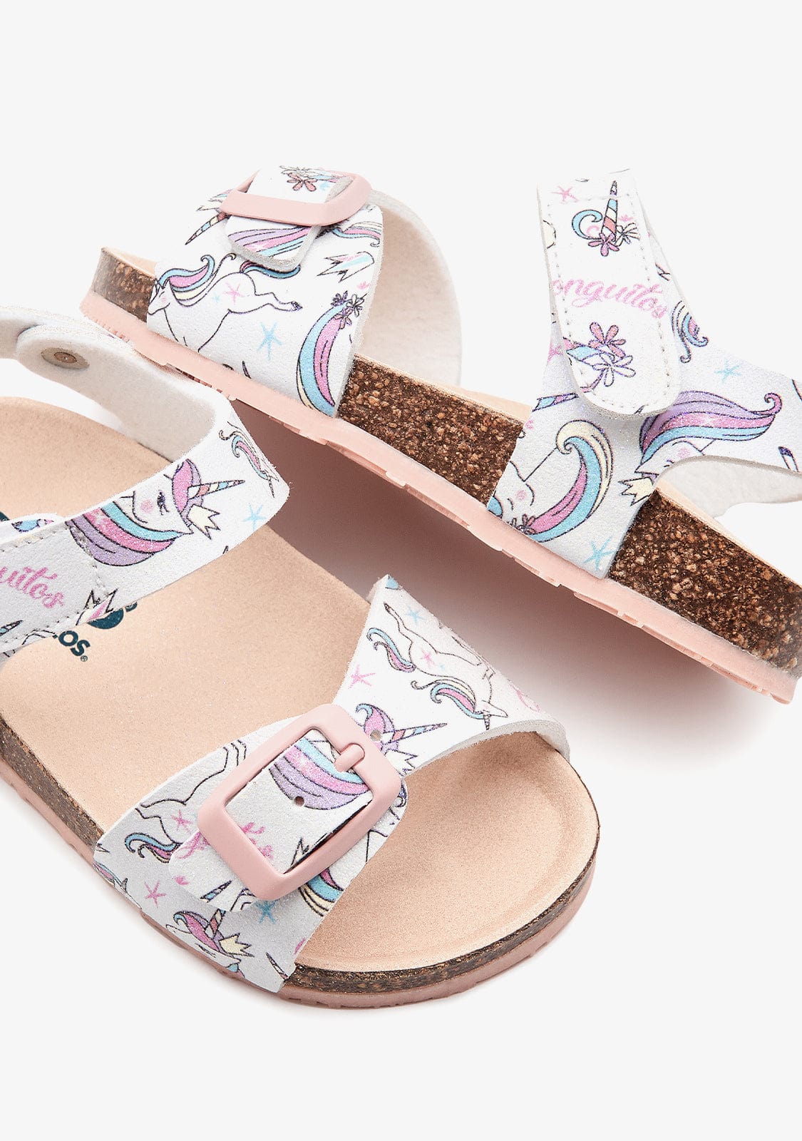 This sandal model has a buckle on the front strap and has a strap fastening for greater comfort. The sandals are white, have unicorn prints and pink details.