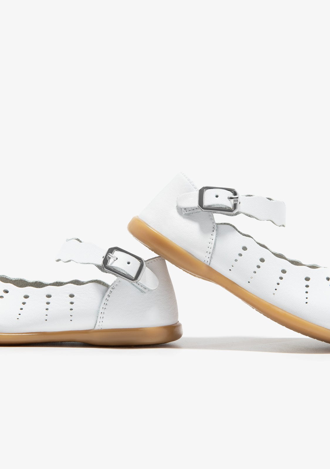 White ballerina with ankle strap and buckle fastening. They are decorated with waves on the rim and a die-cut circle around the edge. They are made in Spain.