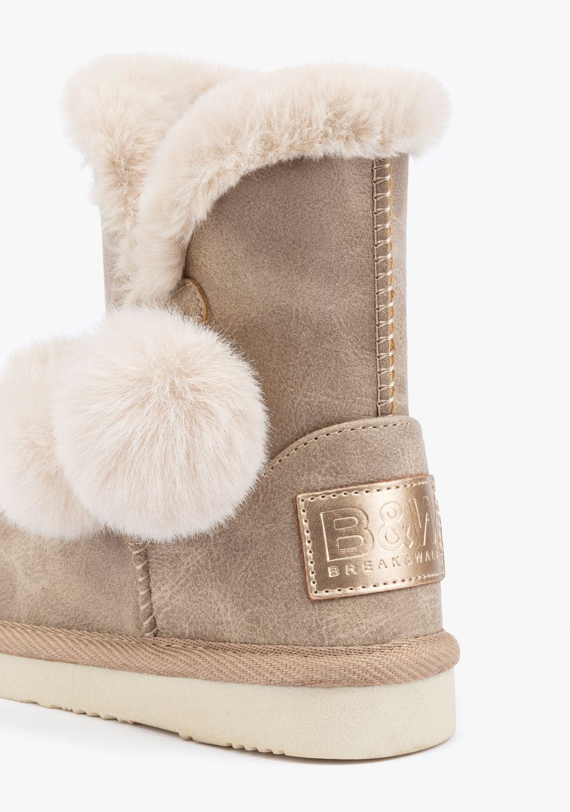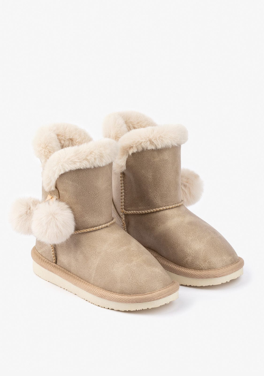These beige boots have a faux fur lining that covers the inside and a matching profile with two pompoms hanging down the side. Also, they have a gold detail on the back.