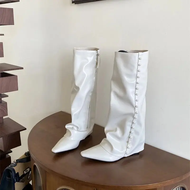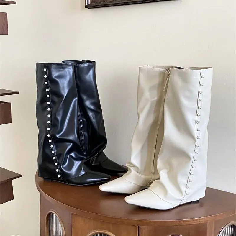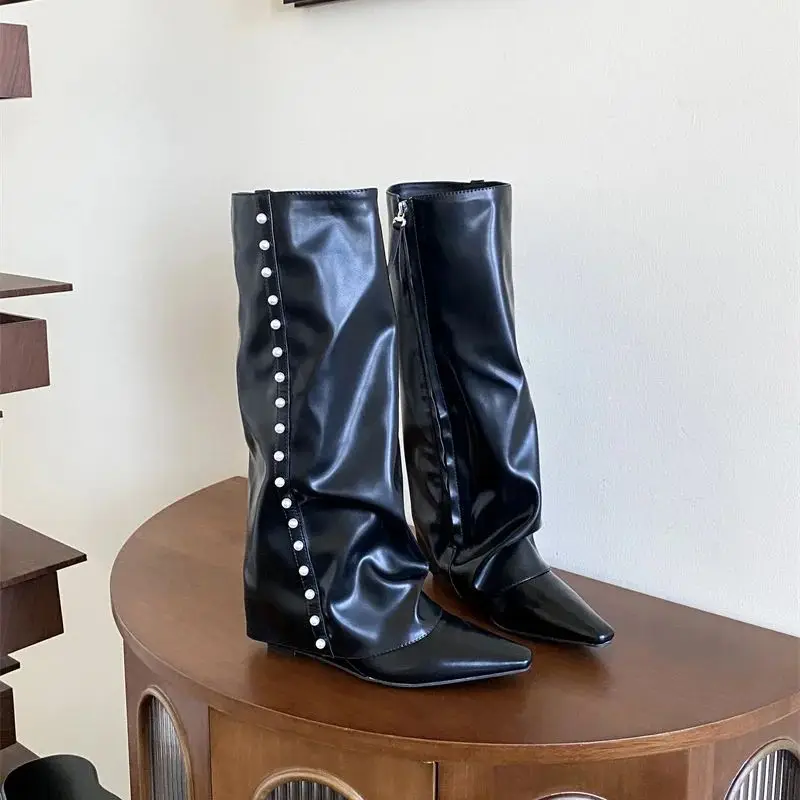 Black Heels Boots Knee High Fall Pointed Toe Wedges Shoe Woman Rivet High-Heeled Trouser Long Boots 2025 Tendencia
