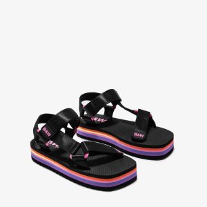 This black model is made of textile and rubber. One of the straps has a strap fastening for greater comfort. The sandals are black with pink details and a colourful sole that gives them a fun touch.