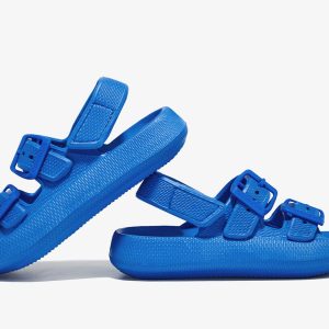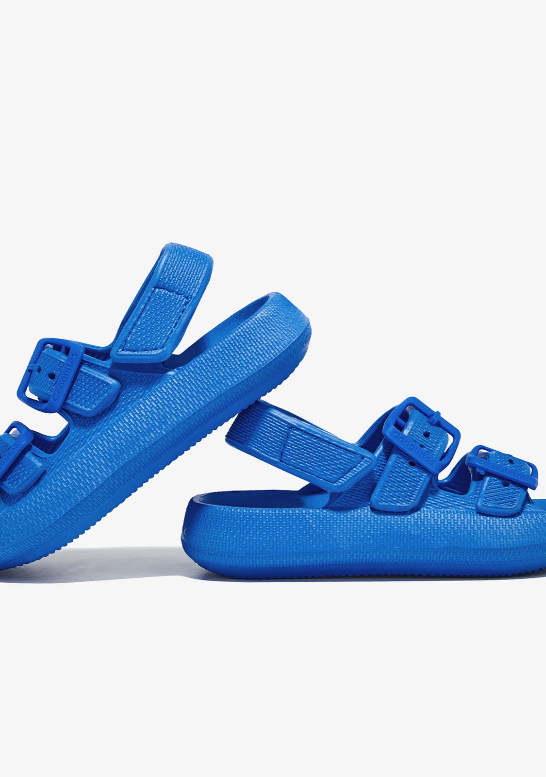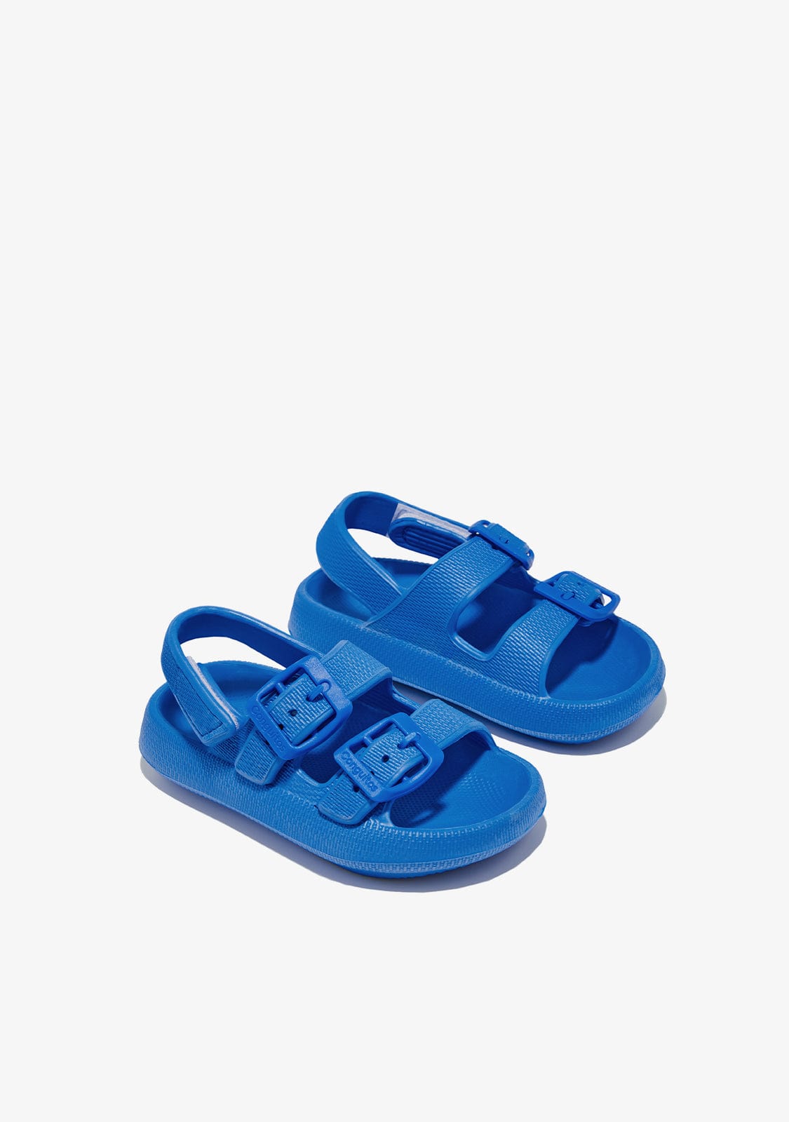 This blue model has 3 straps. Two with a buckle fastening and one with a removable rip-tab fastening. They are made of EVA, which offers extra comfort by moulding to the foot.