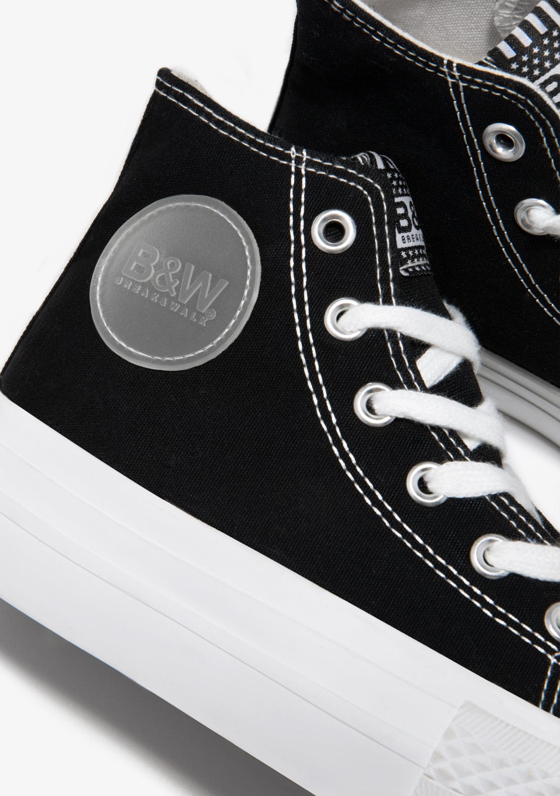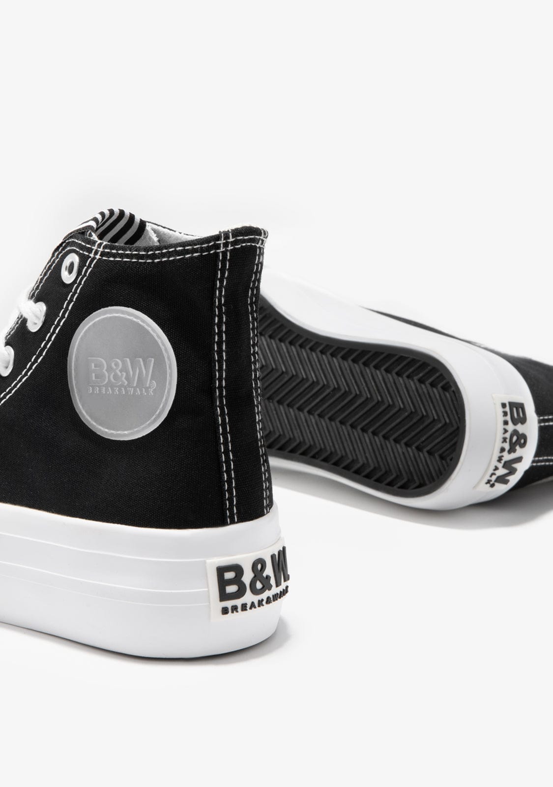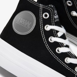 This model combines black canvas with white stitching to match the laces. They have rubber reinforcement on the toe. They are decorated with the B&W emblem in rubber on the shaft and heel.