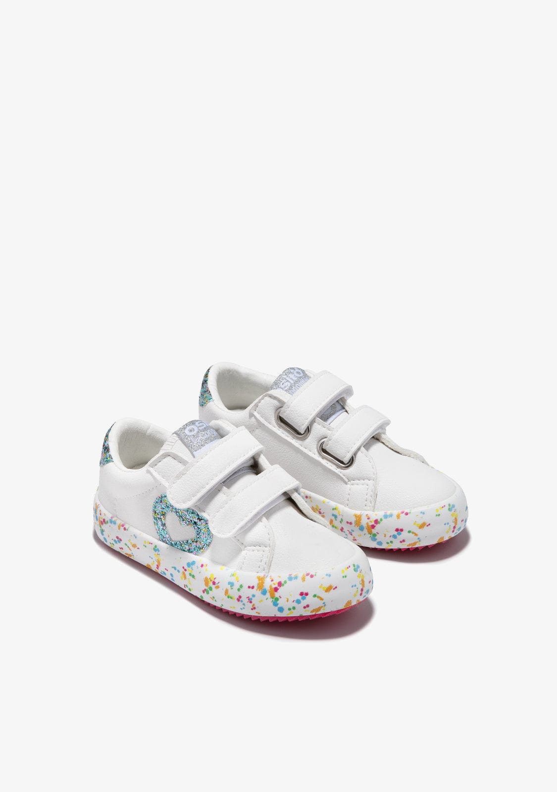 The silver model combines the white micronapa with blue glitter on the heel and a heart on the outer side. They have an easy-to-remove hook-and-loop strap fastener.