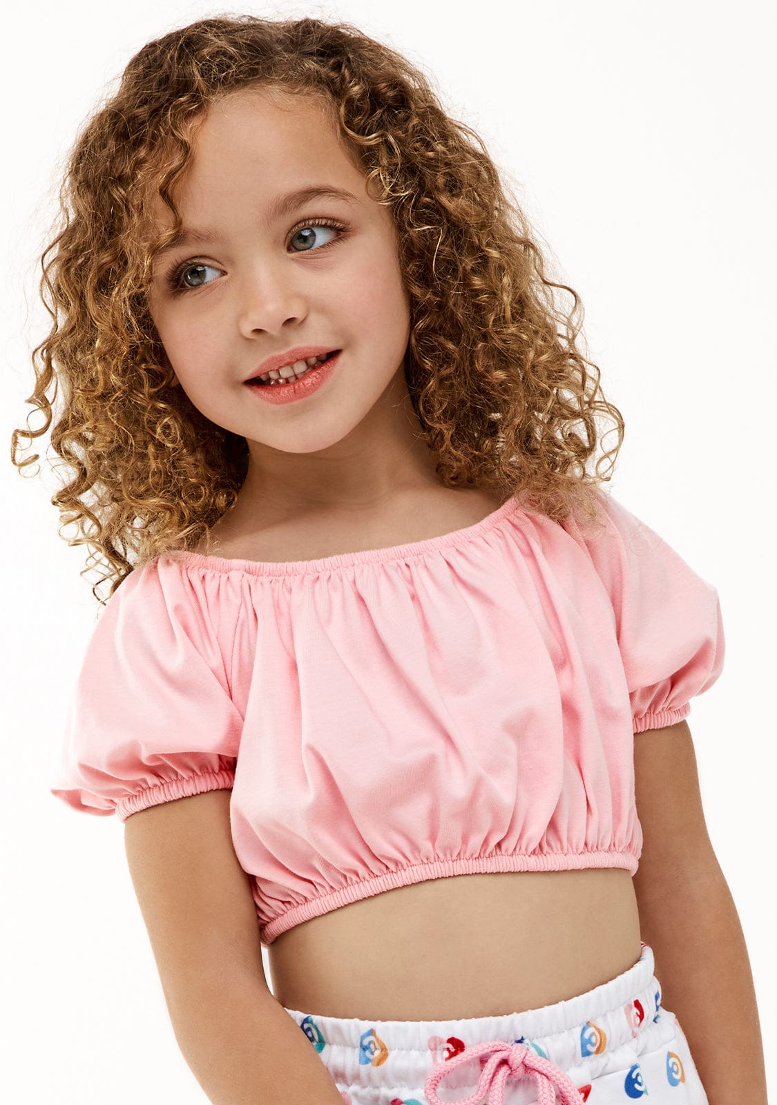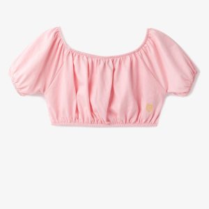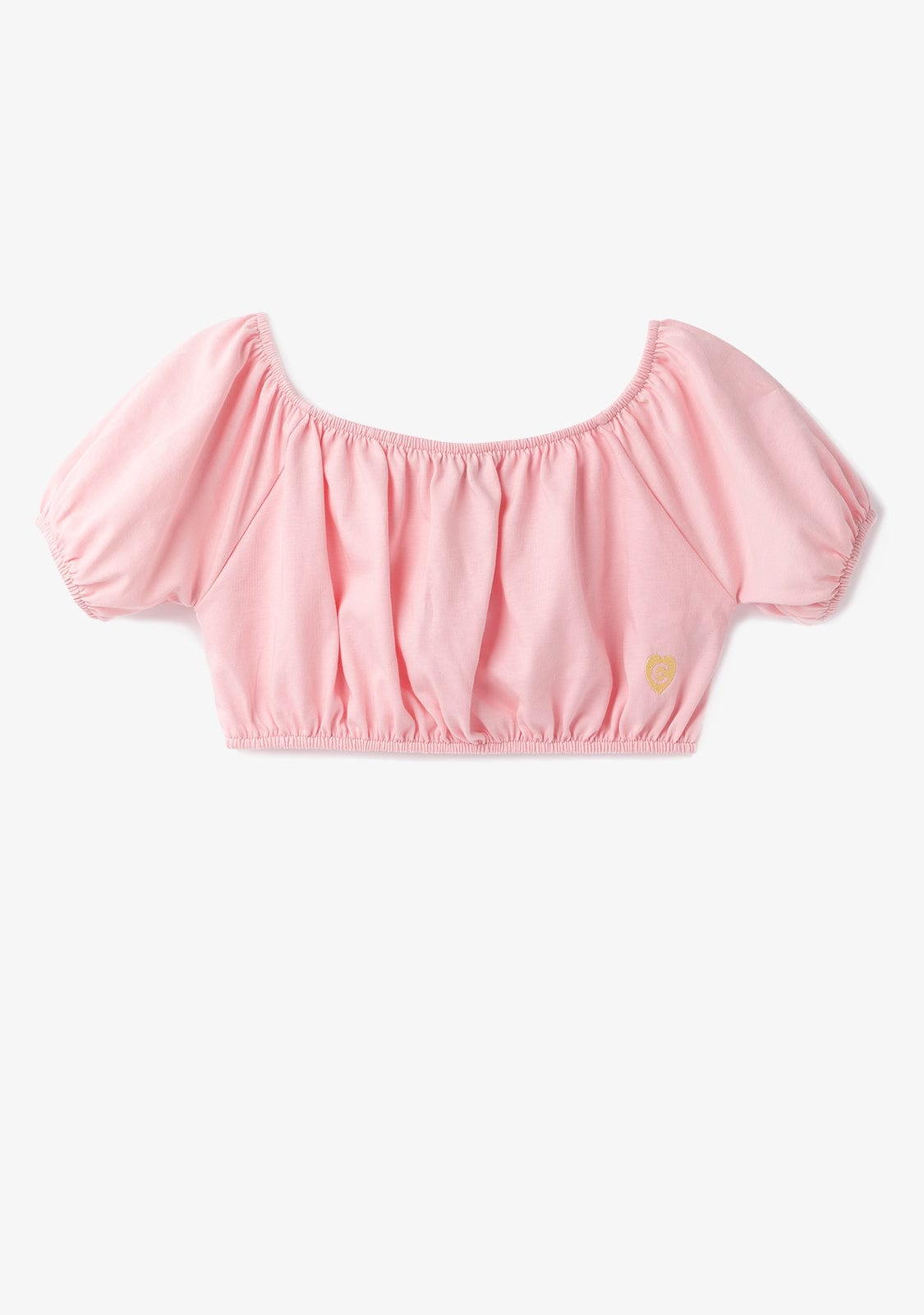 The pink top has short shoulder sleeves and is short. It is finished with an elastic band at the neck and hem for greater comfort. A basic decorated with the Conguitos emblem, ideal for casual occasions.