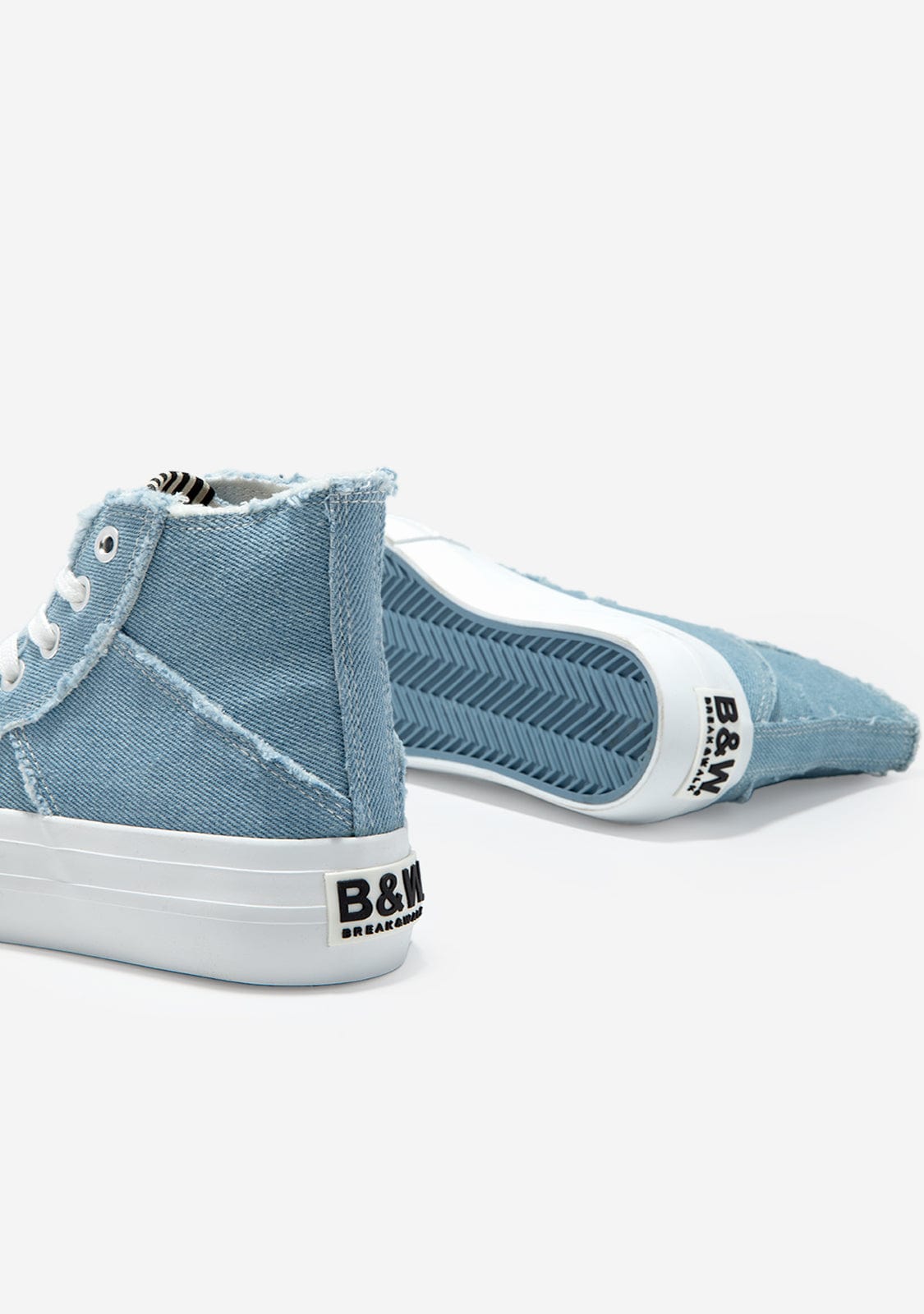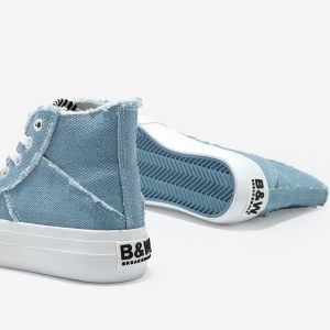 This model is designed in denim fabric with a frayed style. It features white adjustable laces and the B&W emblemon the heel.