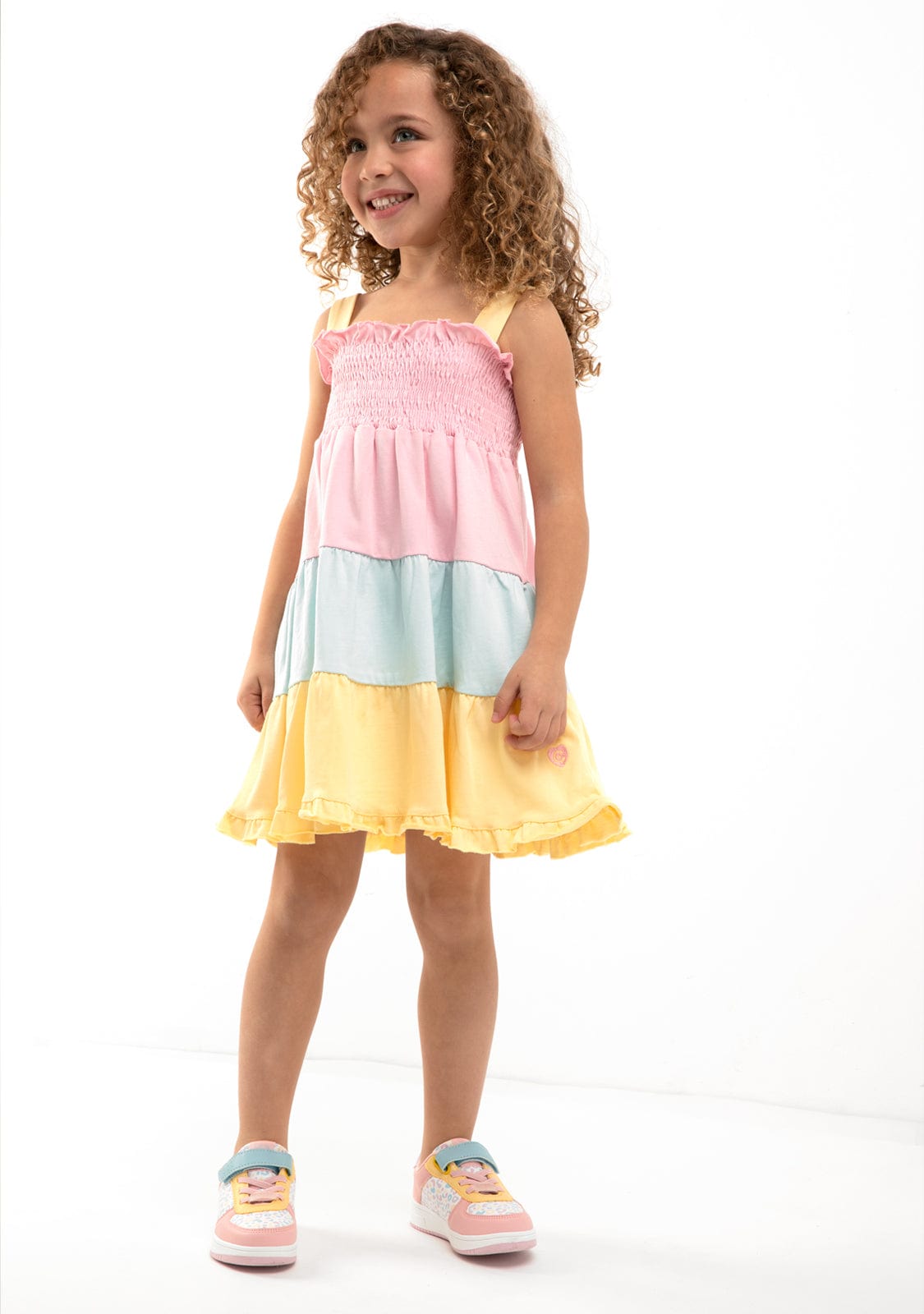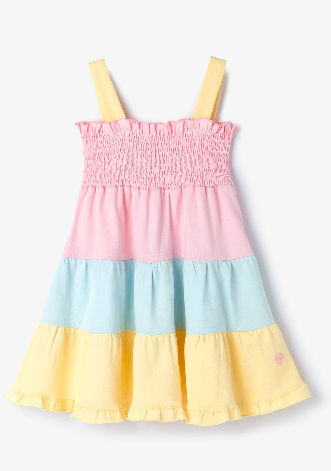 The dress features yellow straps and pink honeycomb. It has 3 ruffles in pink, blue and yellow, giving it the perfect length for the little ones’ comfort.