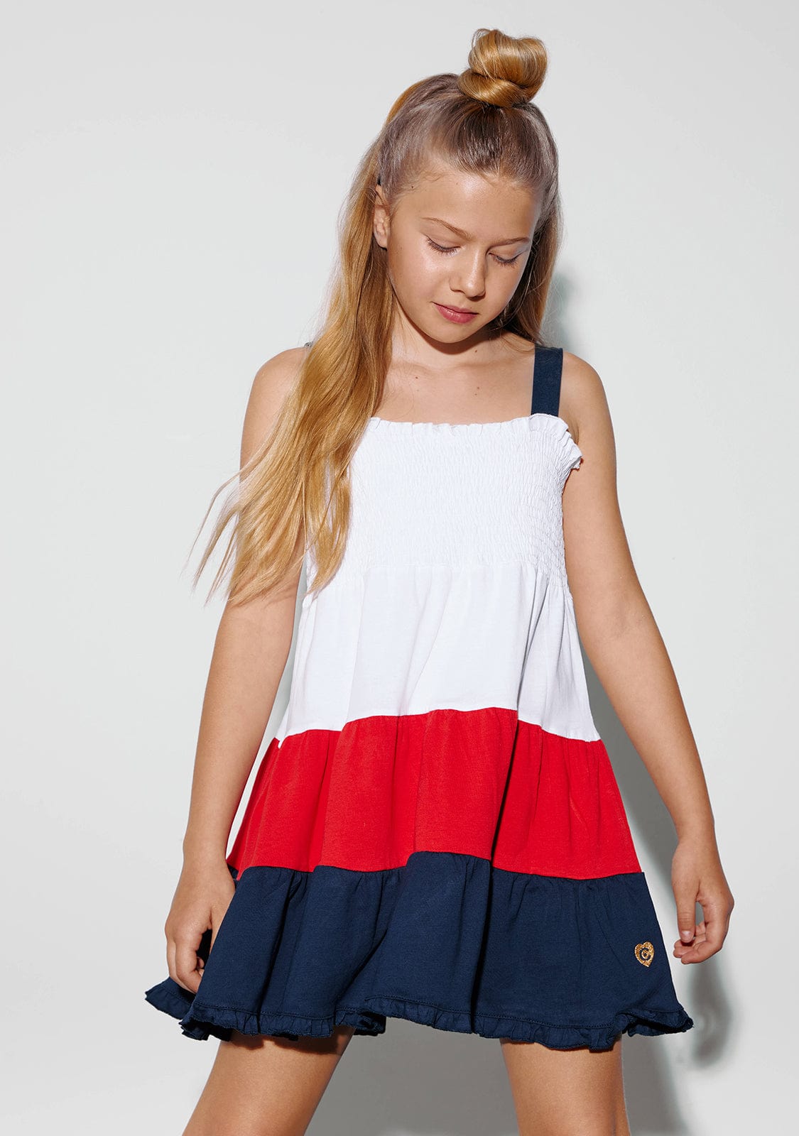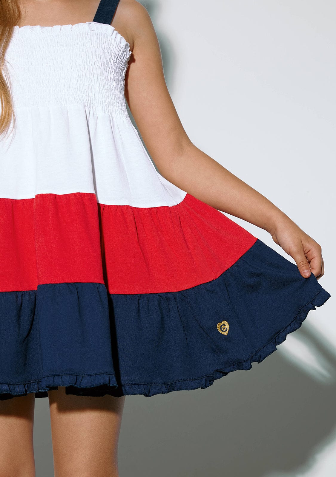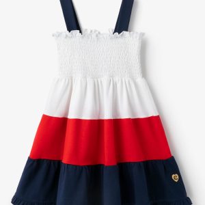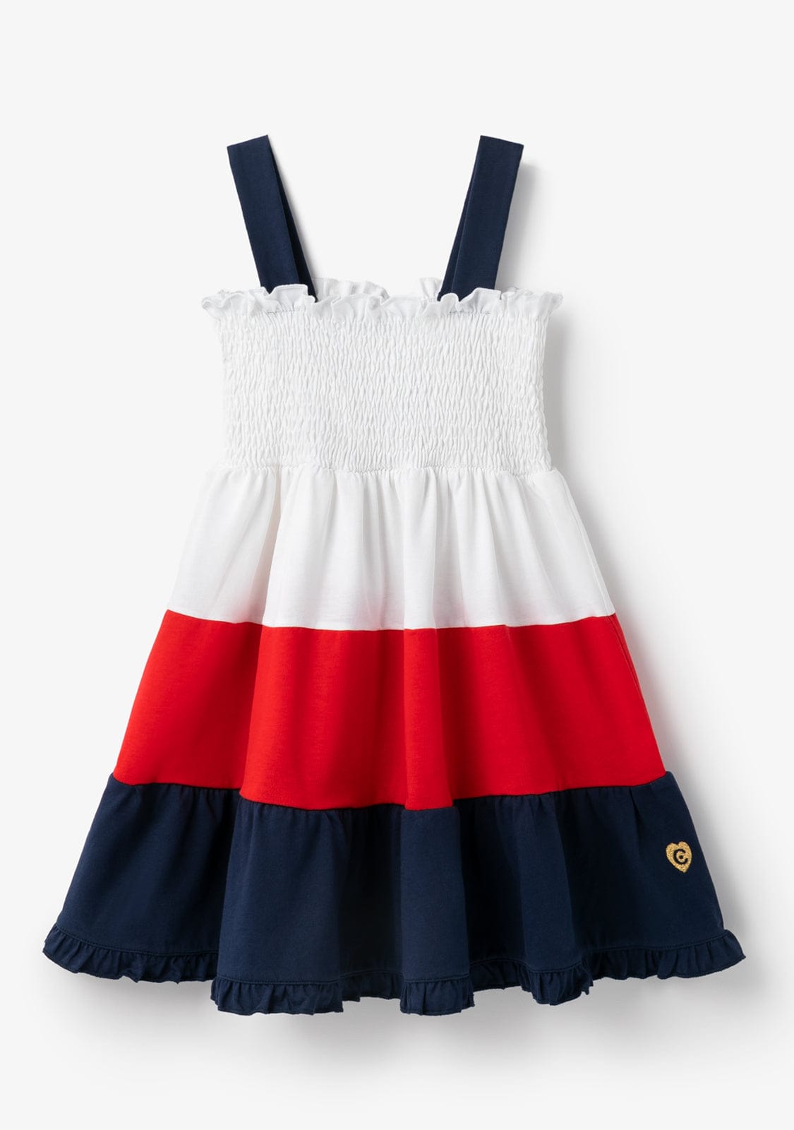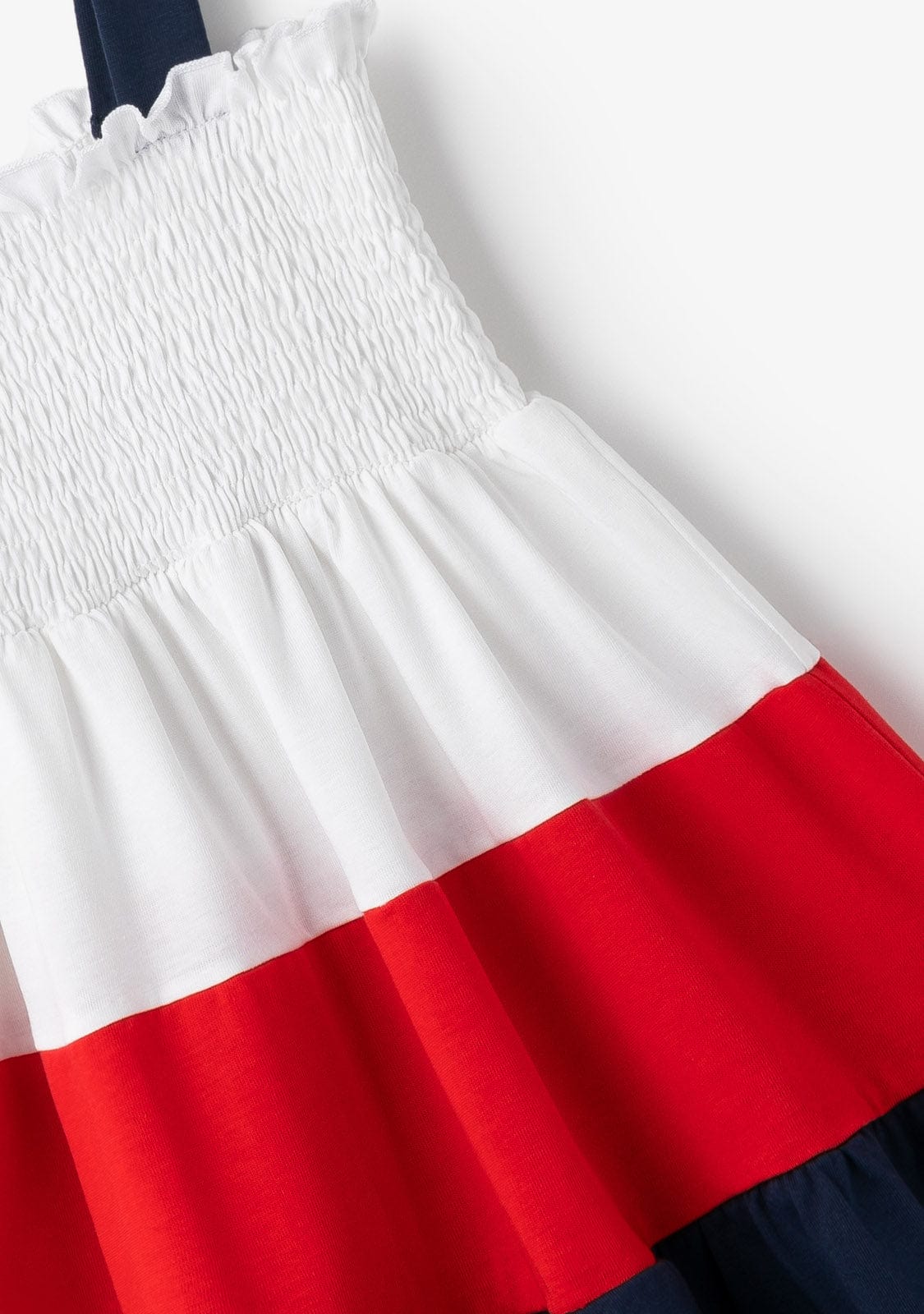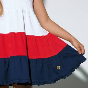 The white dress features wide navy blue straps and white honeycomb. It has 3 ruffles in white, red and blue, giving it the perfect length for the little ones’ comfort.