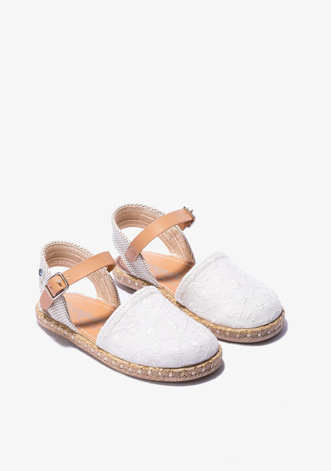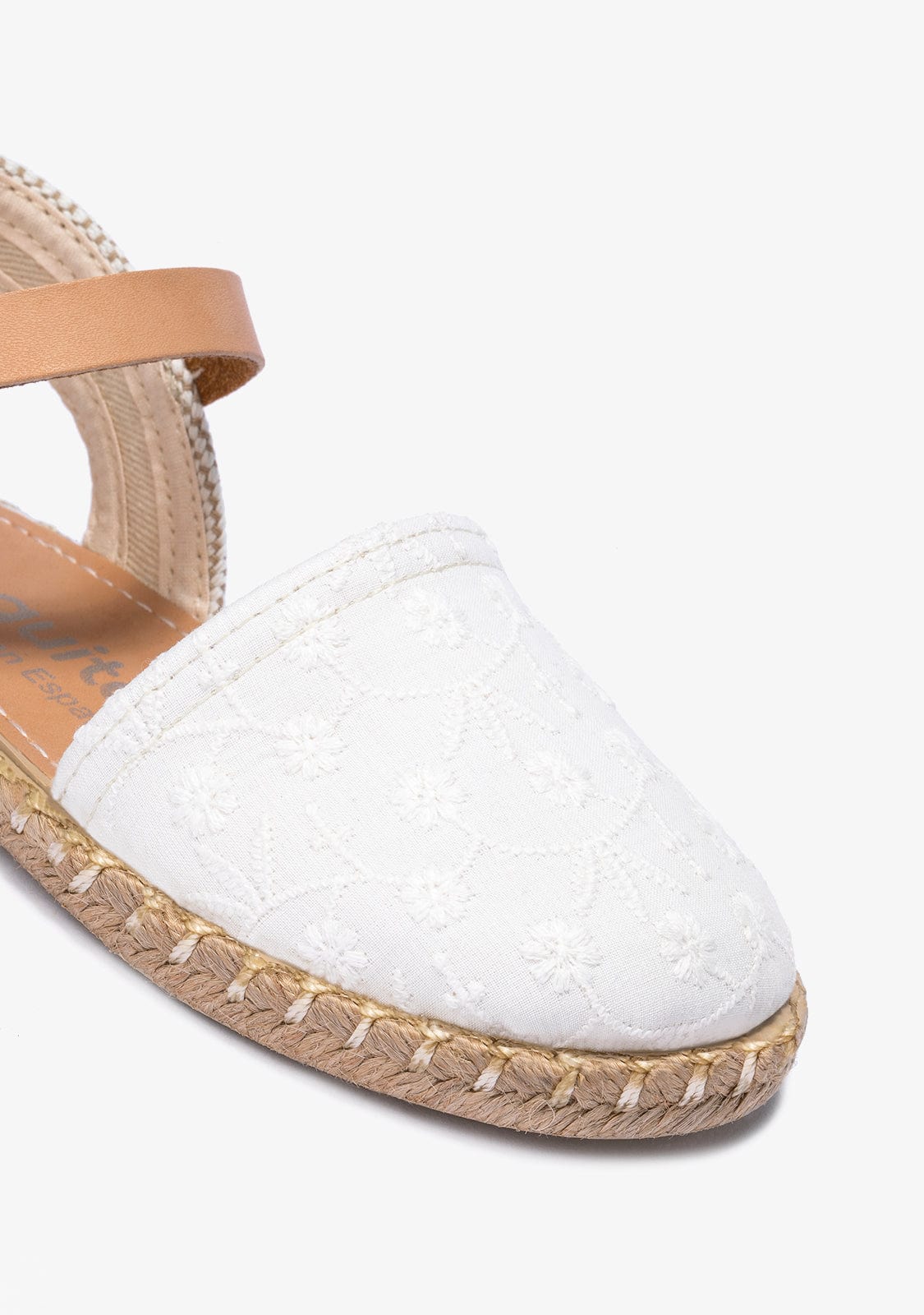 White espadrilles with brown details. They have a closed front and are made of white fabric with embroidered daisies. They have a brown bracelet with a buckle for a better fastening to the foot.