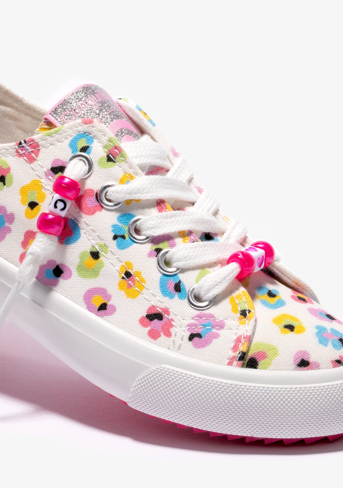 The canvas trainers feature elastic on the inside to make them easy to put on and take offThey have the Conguitos emblem on the upper in pink and silver tones.