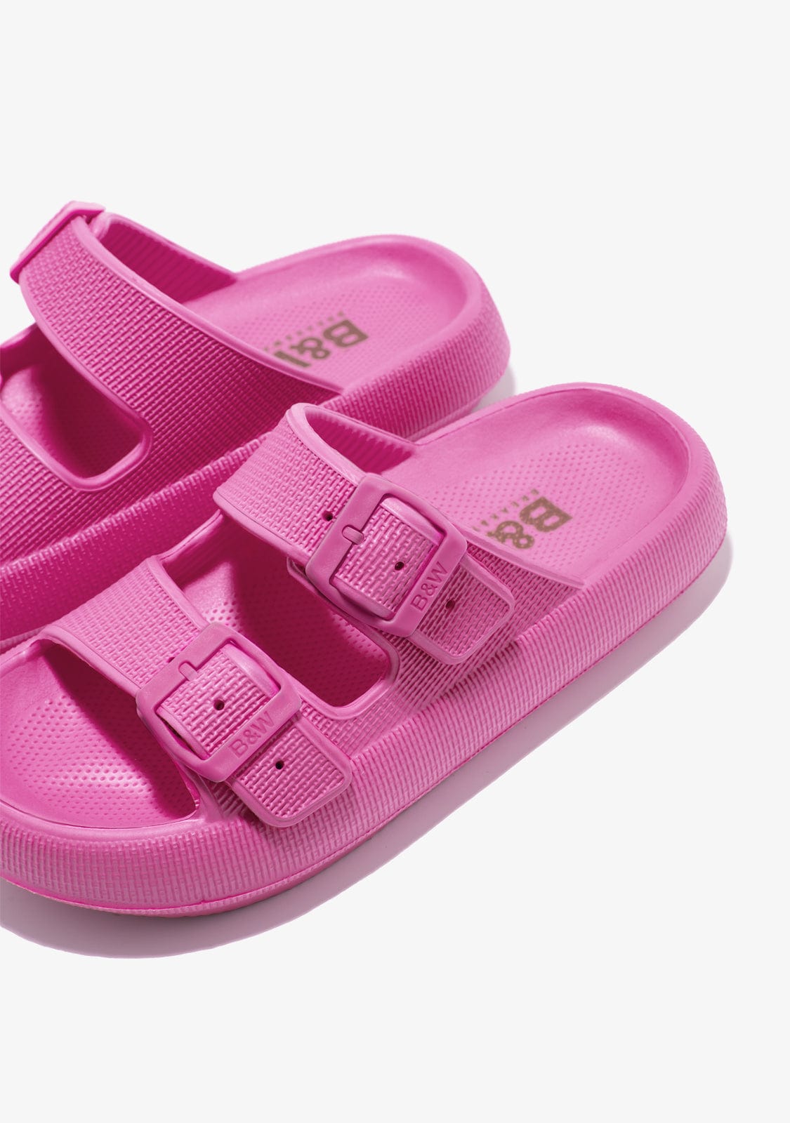 Fuchsia-coloured sandals. This rounded silhouette model has two straps with buckle fastening. They offer extra comfort and moulds to children’s feet. They feature the B&W logo on the sole.