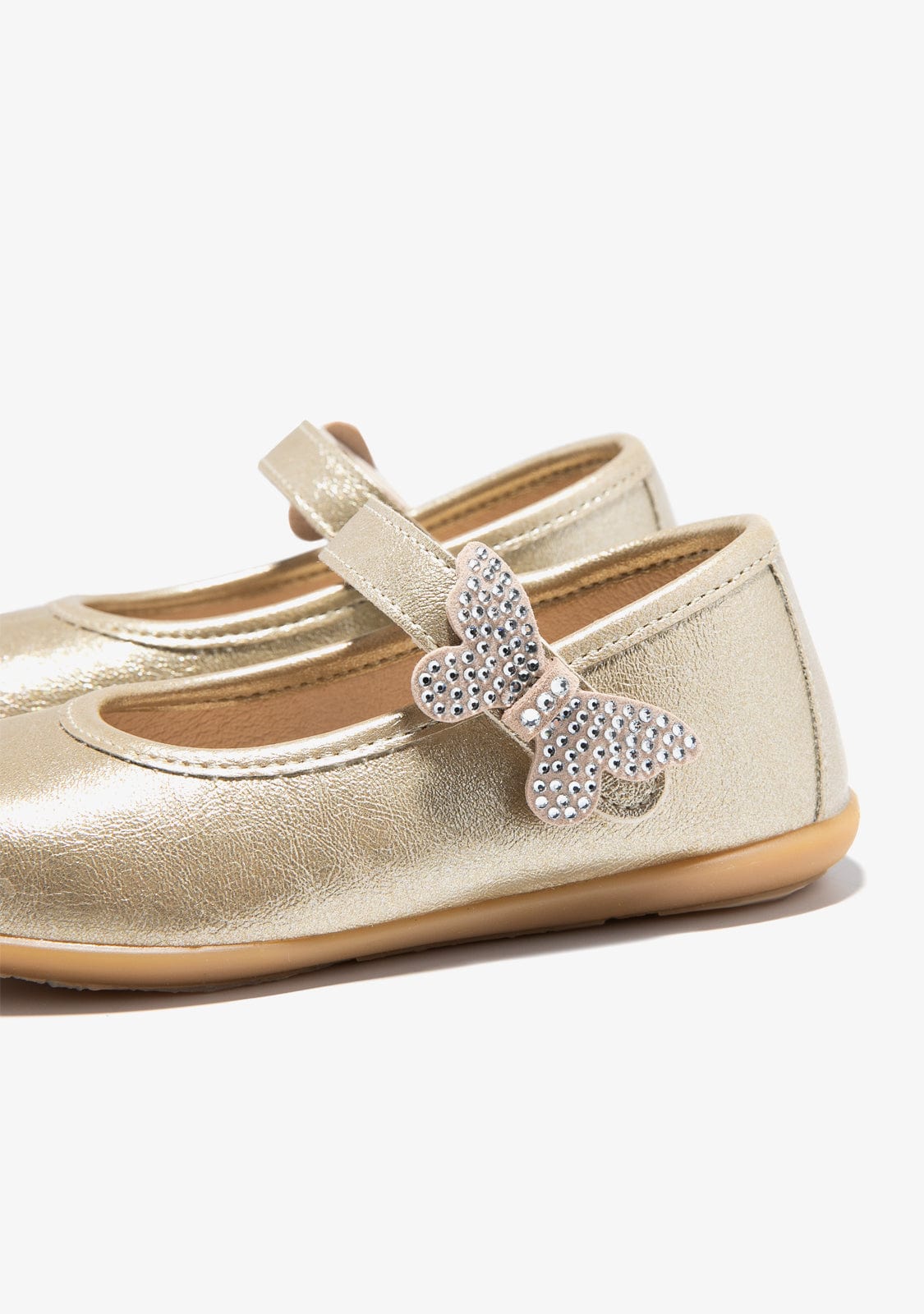 This gold model has an easy slip-on and off strap. They are decorated with a butterfly with rhinestones and have a golden trim on the edge.
