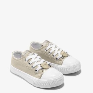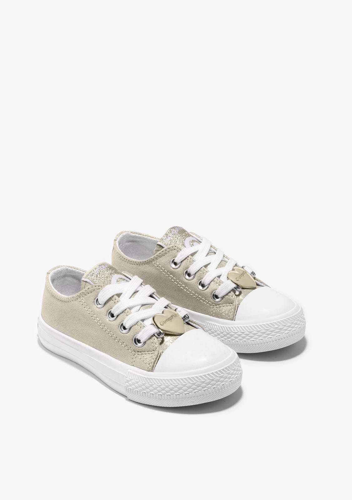 This gold-finish model features the Conguitos emblem on the heel. It has white laces adorned with a heart-shaped appliqué. It has a reinforced toecap that provides resistance.