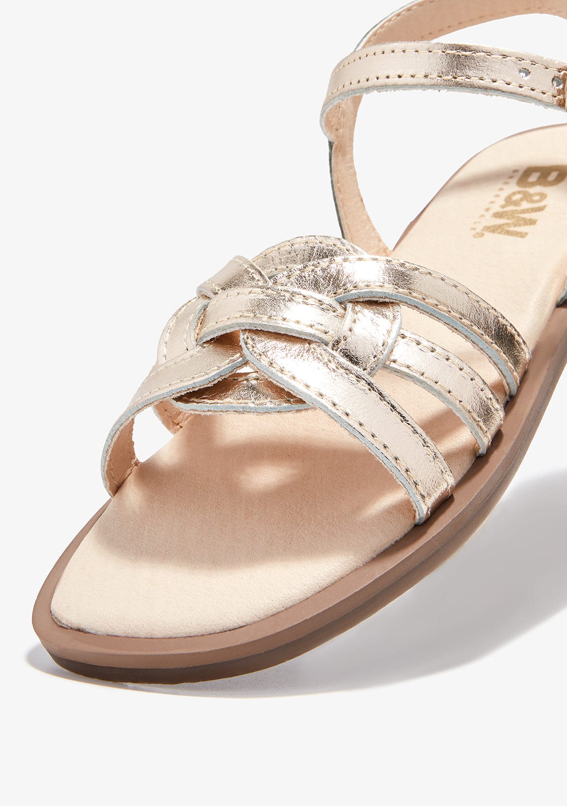 These sandals are made of metallic gold leather and also have a metal buckle closure.
