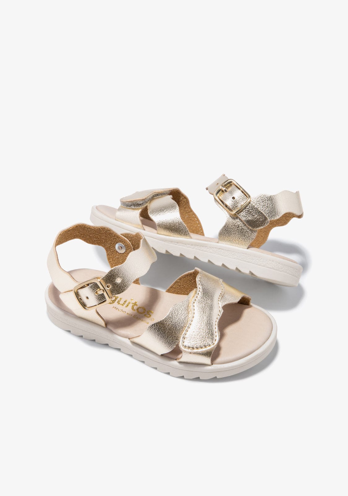 These sandals have a metallic buckle fastening and an adjustable strap fastening. The straps are golden with a metallic finish and have wave-shaped edges.