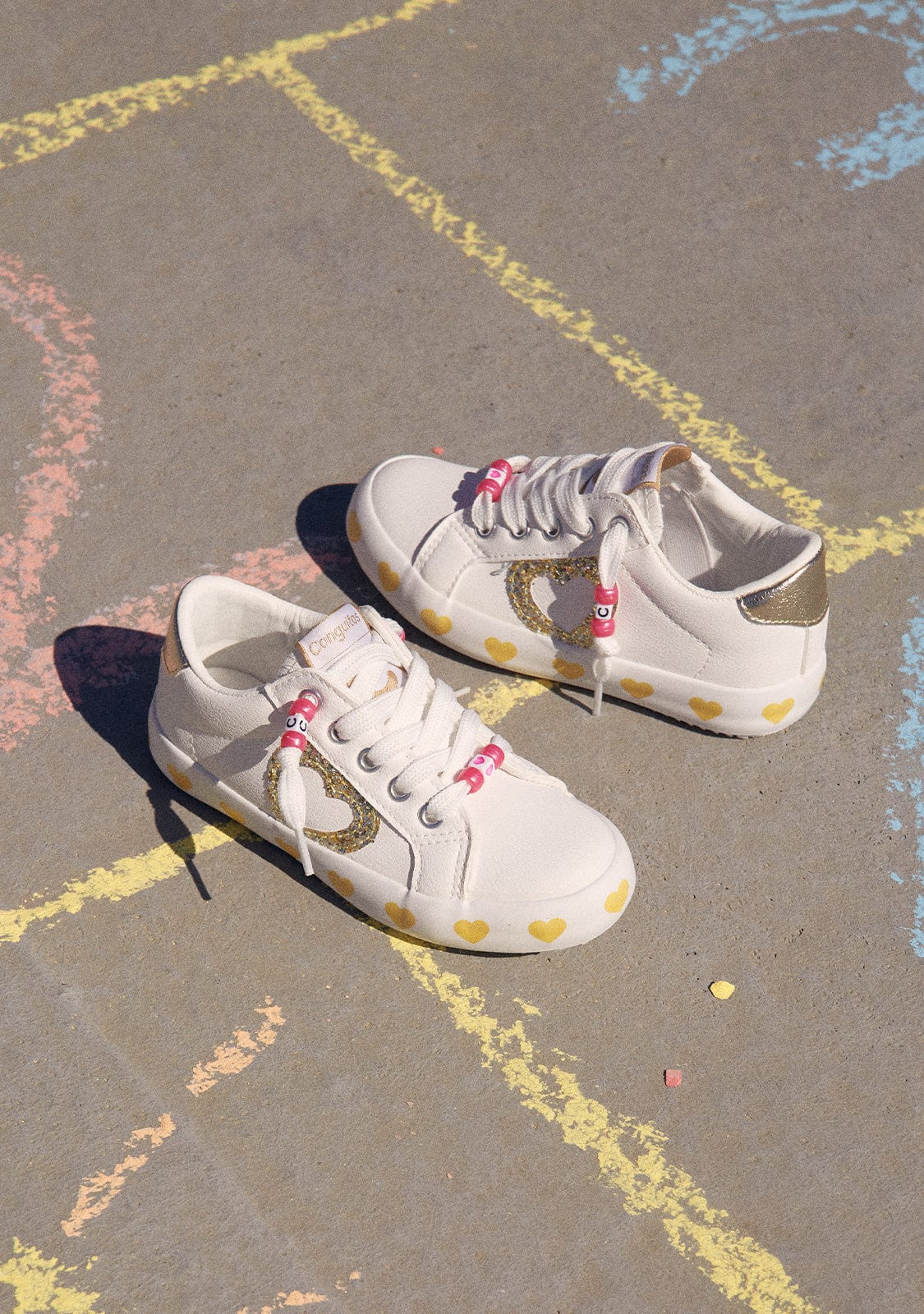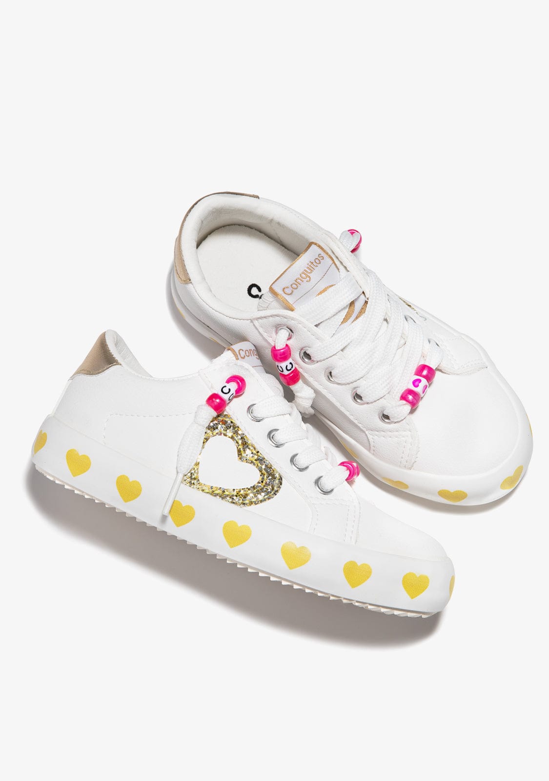 This model combines white and gold micronapa . The trainers are decorated with a gold glitter heart and around the sole. They have elastic on the inside to make them easy to put on and take off.