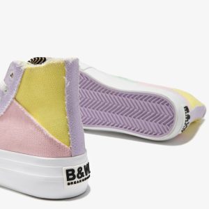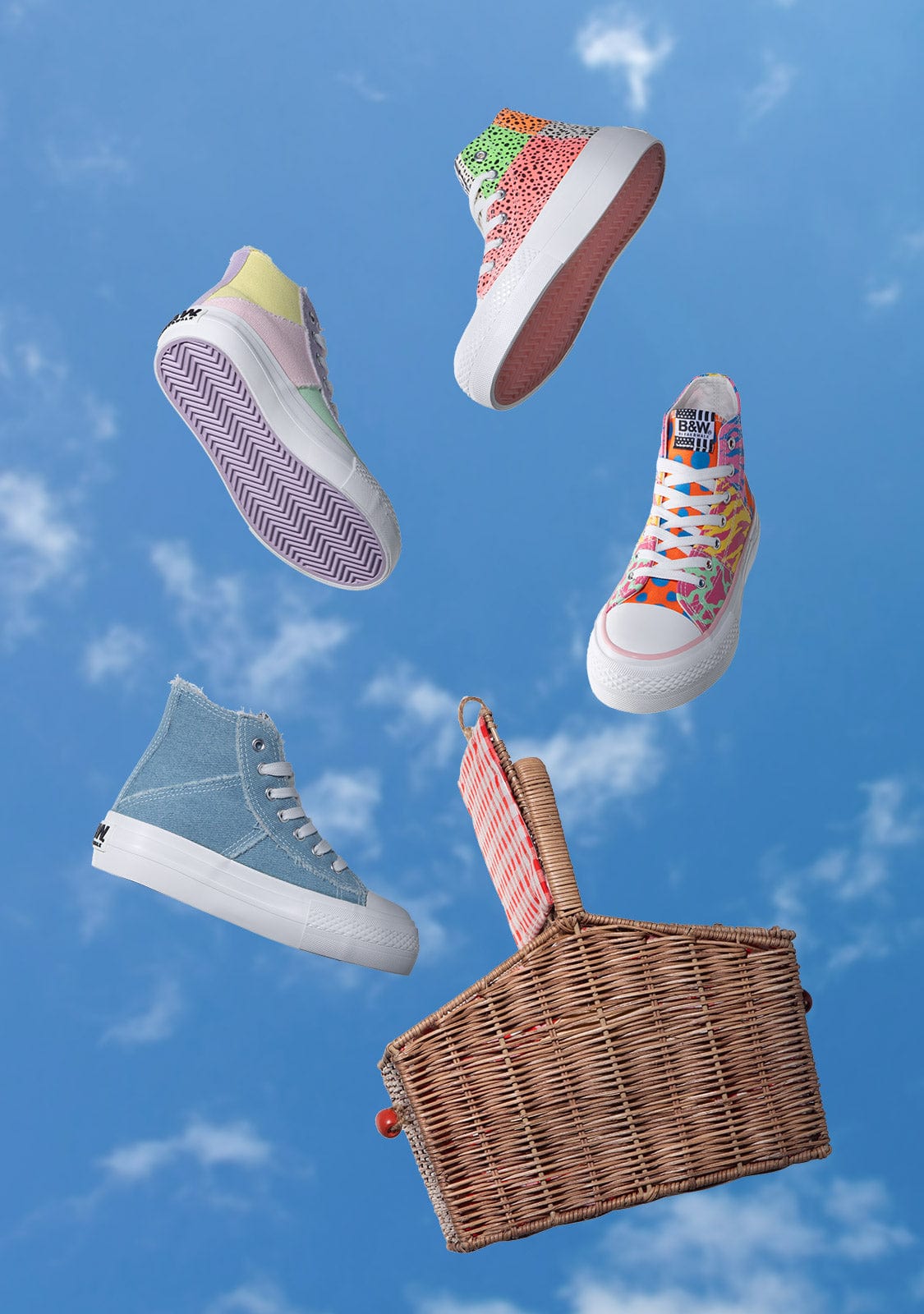 This model is designed in cotton fabric with a frayed style. It features white adjustable laces and the B&W emblemn the heel.