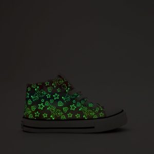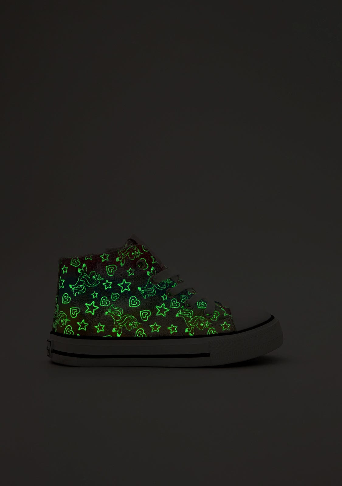 This multicoloured model is decorated with unicorn, heart and star prints that glow in the dark. It features our emblem on the heel. Also, it has adjustable laces and a reinforced toe for durability. In addition, it has a zip on the inside for added convenience.