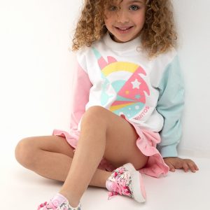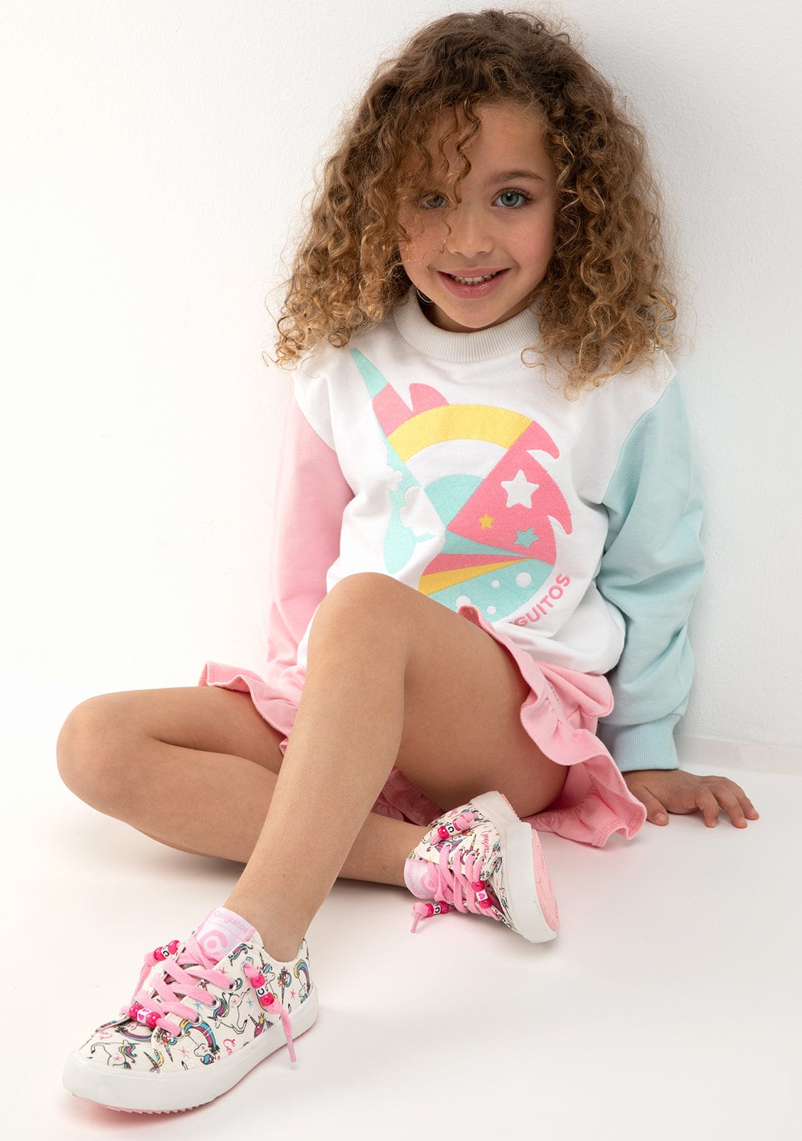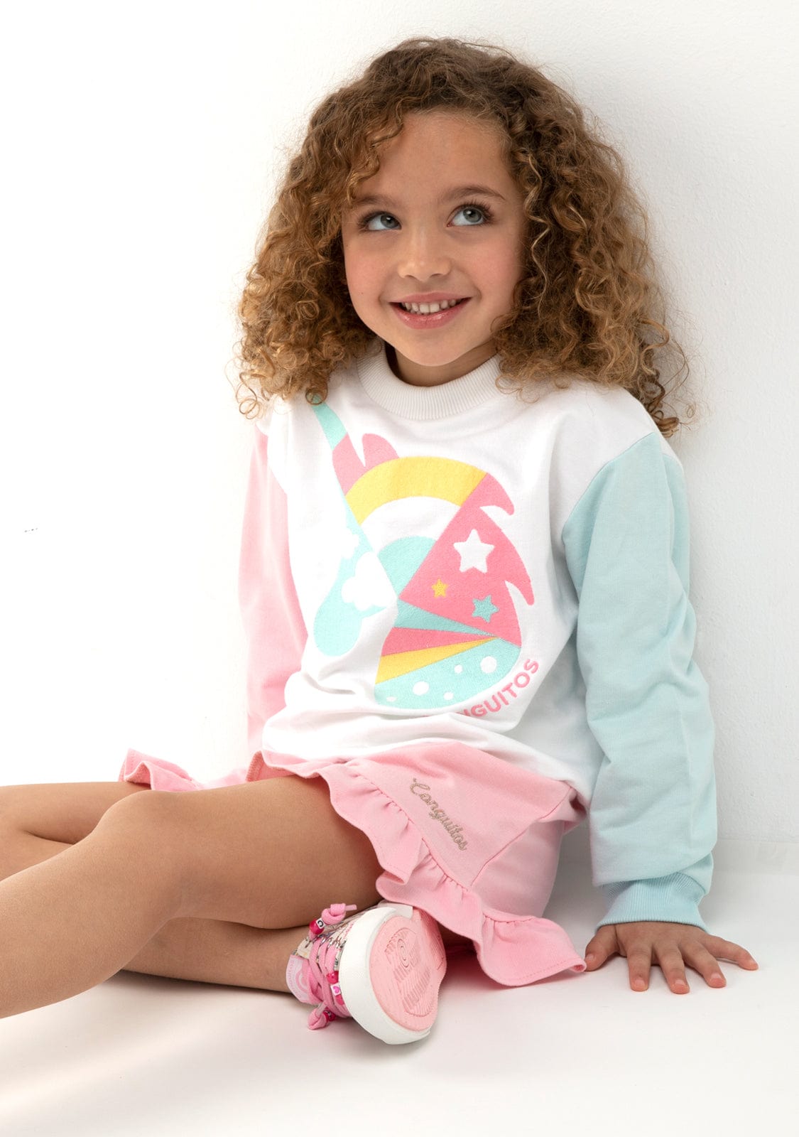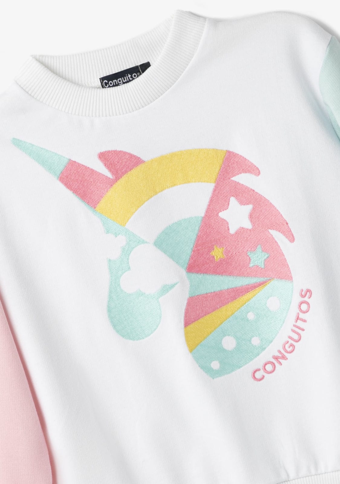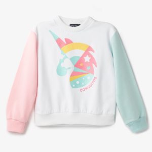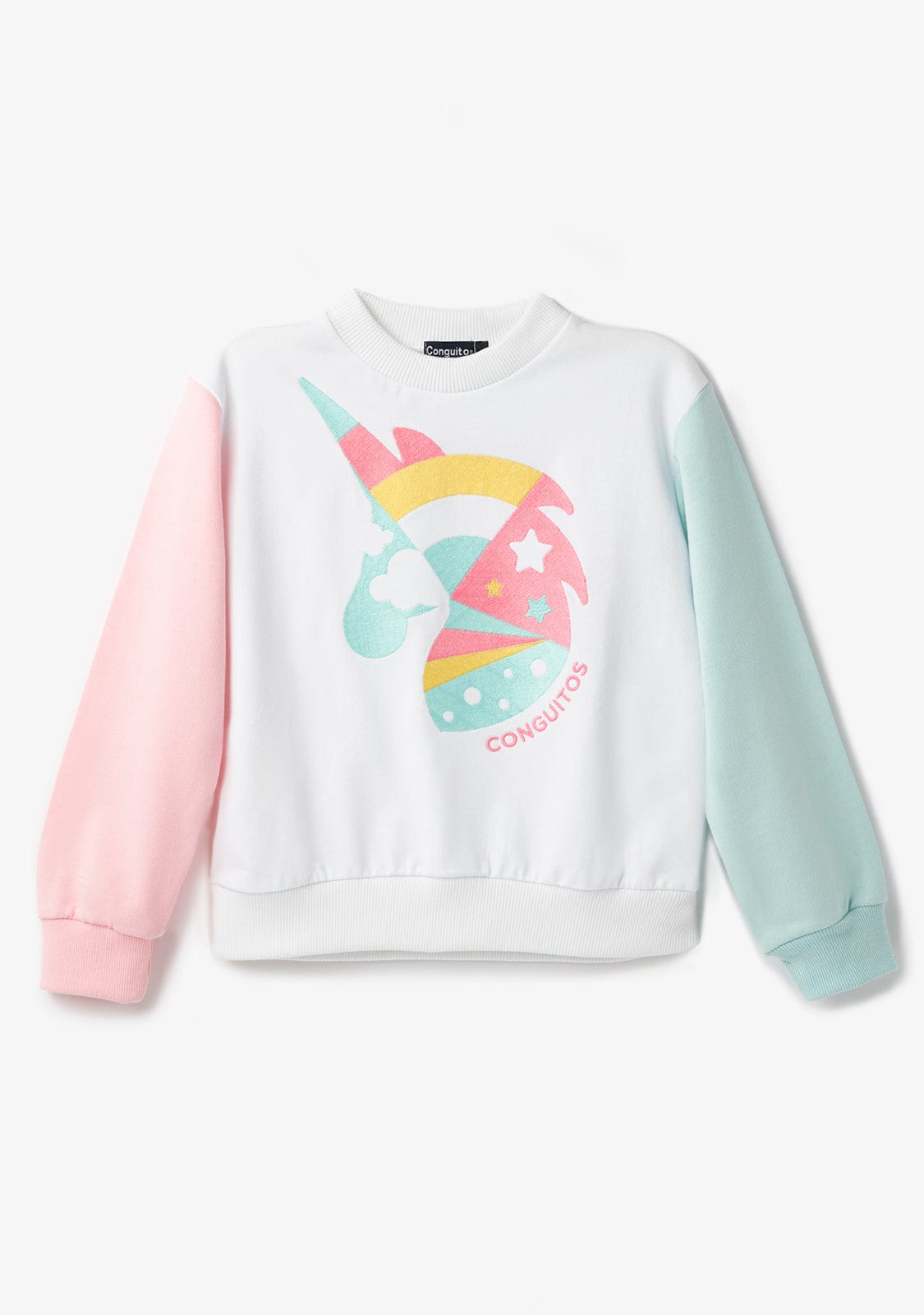 Cotton sweatshirt with straight sleeve . It features a colourful unicorn embroidery to brighten up your routine. The colourful sleeves add a fun touch. It has cuffs, collar and hem for a better fit. Perfect for cool summer evenings.