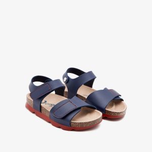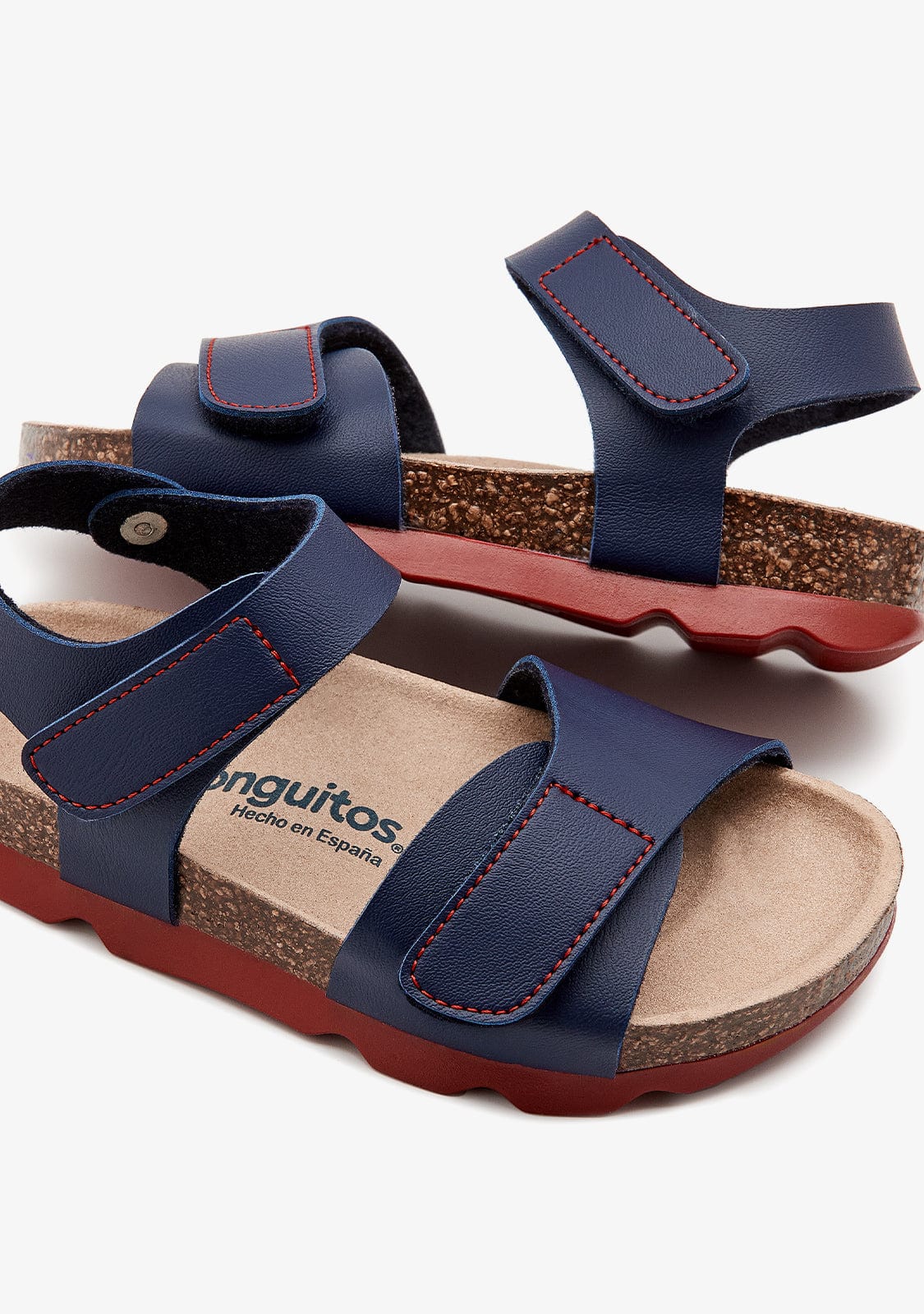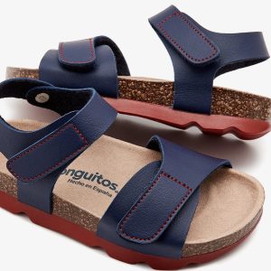 This model has a fastening with adherent straps that are easy to take off and put on. They are blue with red stitching to match the red sole. Their insole adapts to the foot for greater comfort.