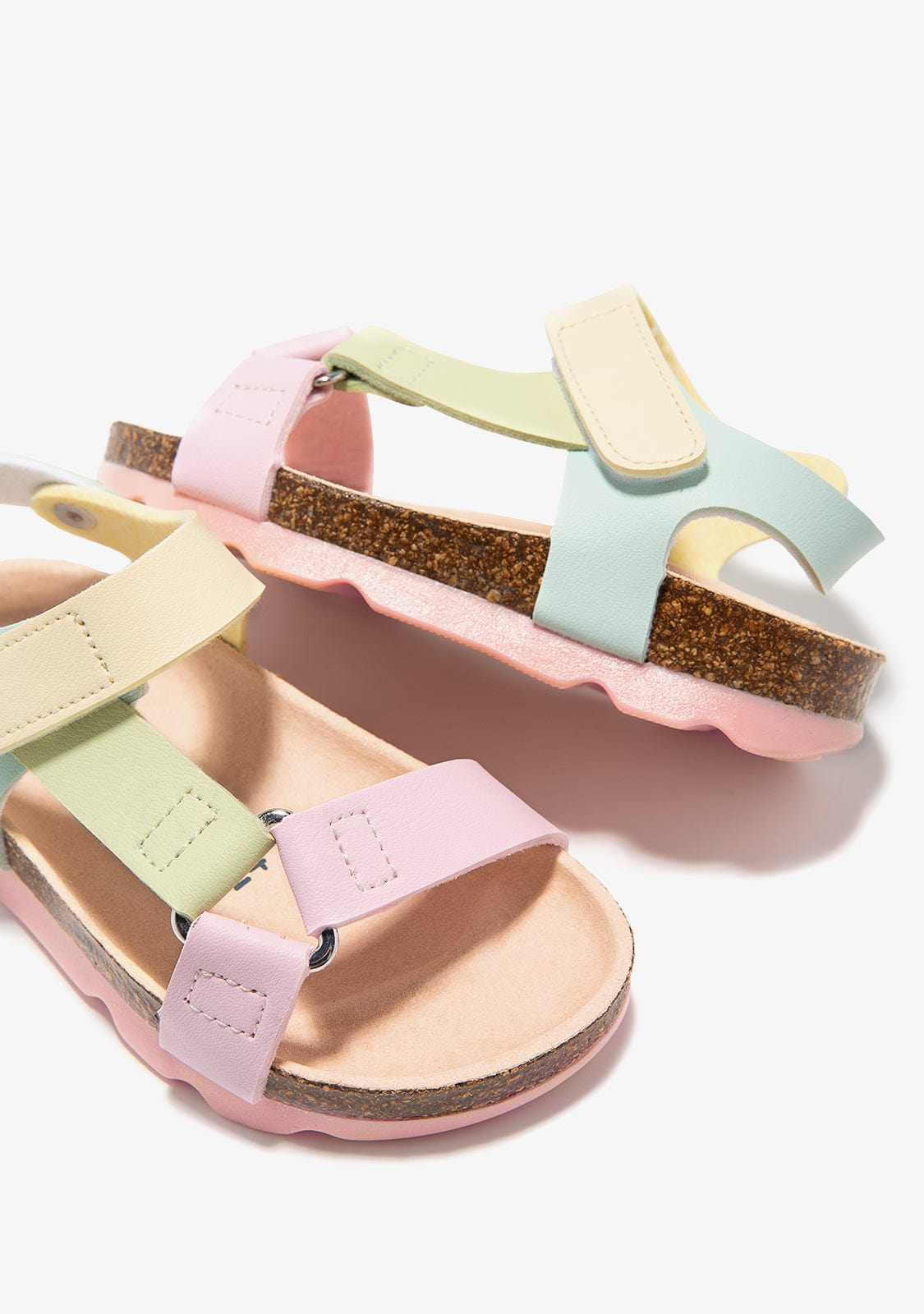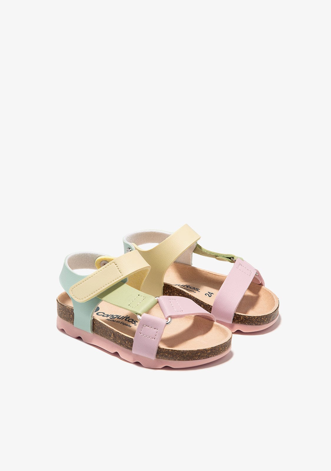 These sandals have pastel coloured straps. The fastening is made of an adjustable adherent strap, which provides support to the ankle and comfort when taking off and putting on the sandal. They have a synthetic insole that moulds to the shape of the foot.