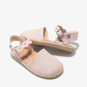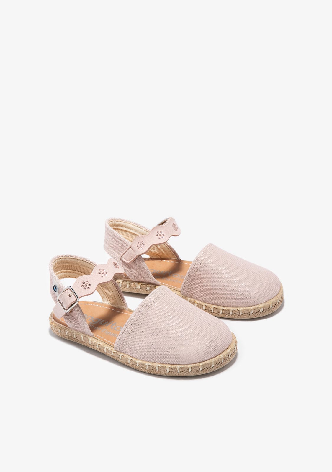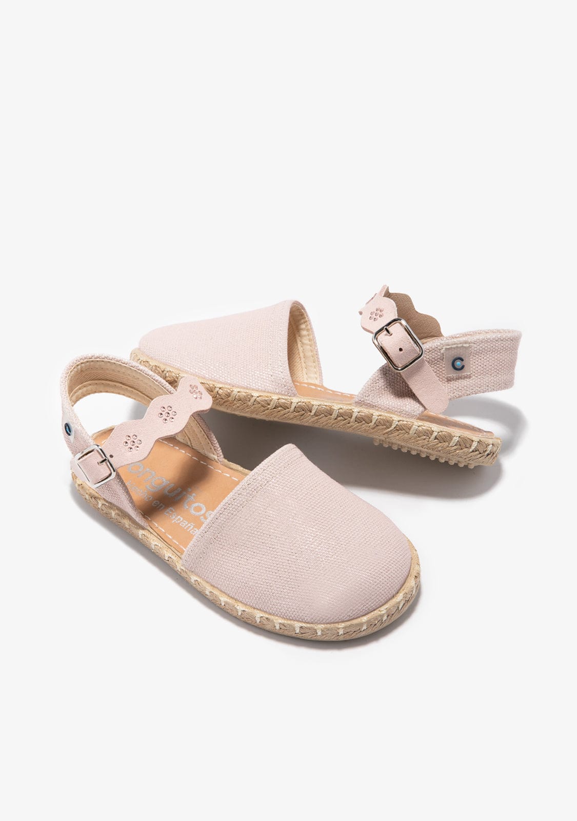 Pink espadrilles with details . The front part is closed and made of beige fabric. They have a buckle fastening for a better fit to the foot and the strap ispink with flower strass. It has the Conguitos logo on the back.