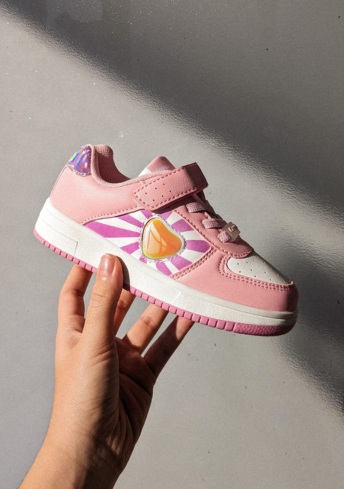 These sneakers are decorated with a heart on the outer side that lights up with every step. It also has a sunlight reactive area that changes colour to pink for added whimsy.