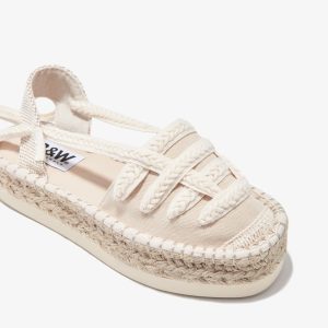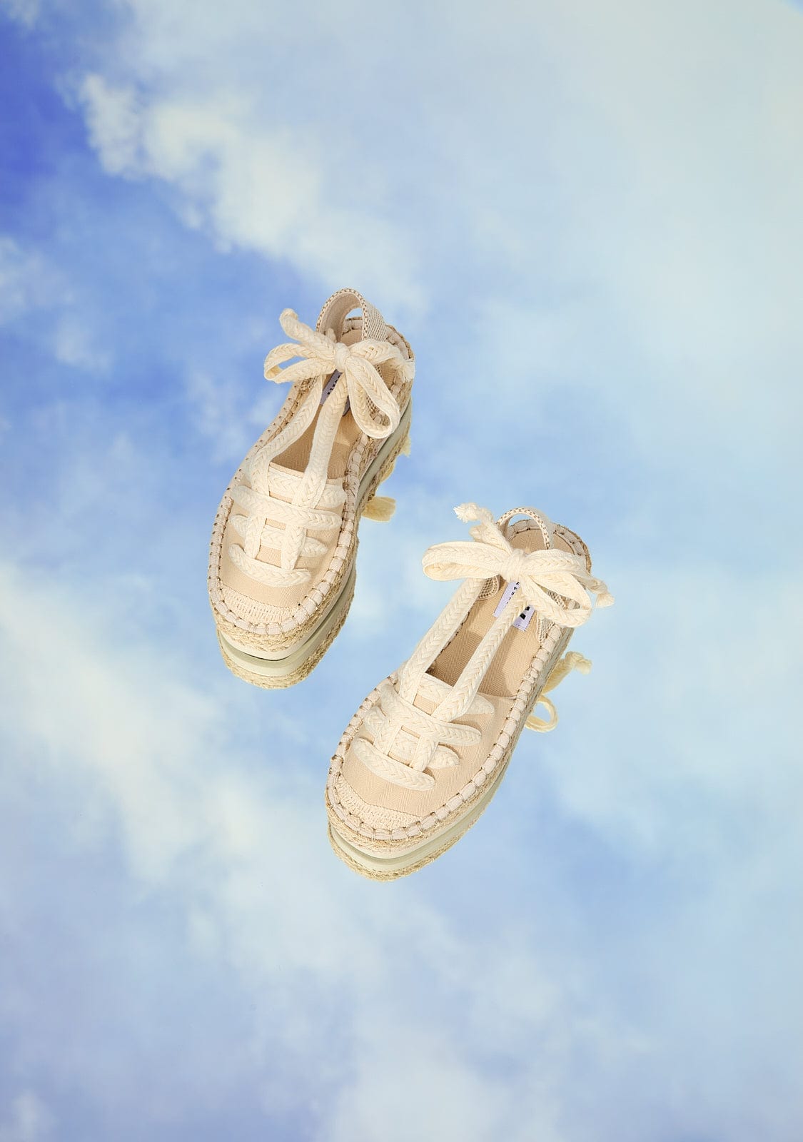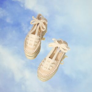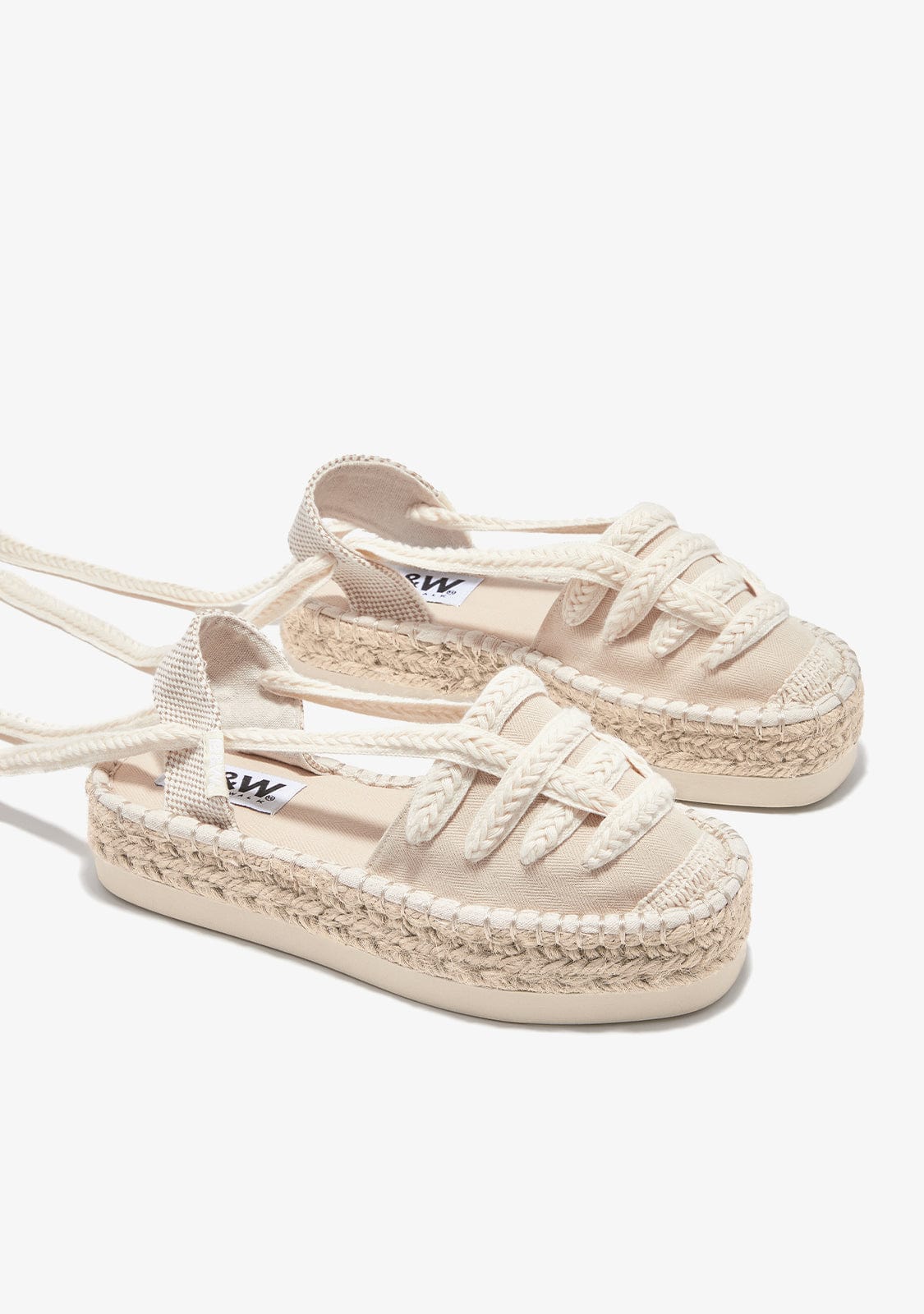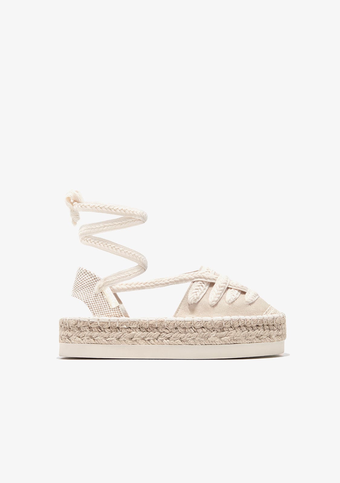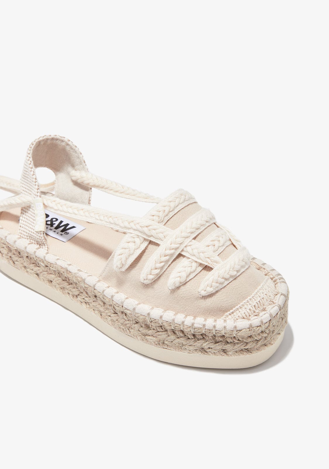 These sand-coloured espadrilles are made from canvas. They have a closed toe and are made of jute. They are tied to the leg with braided ribbons that give a special touch to the footwear.