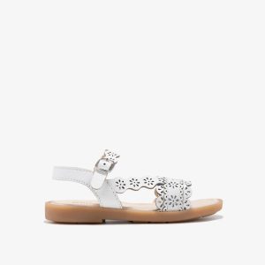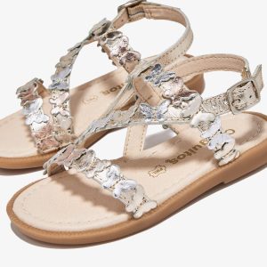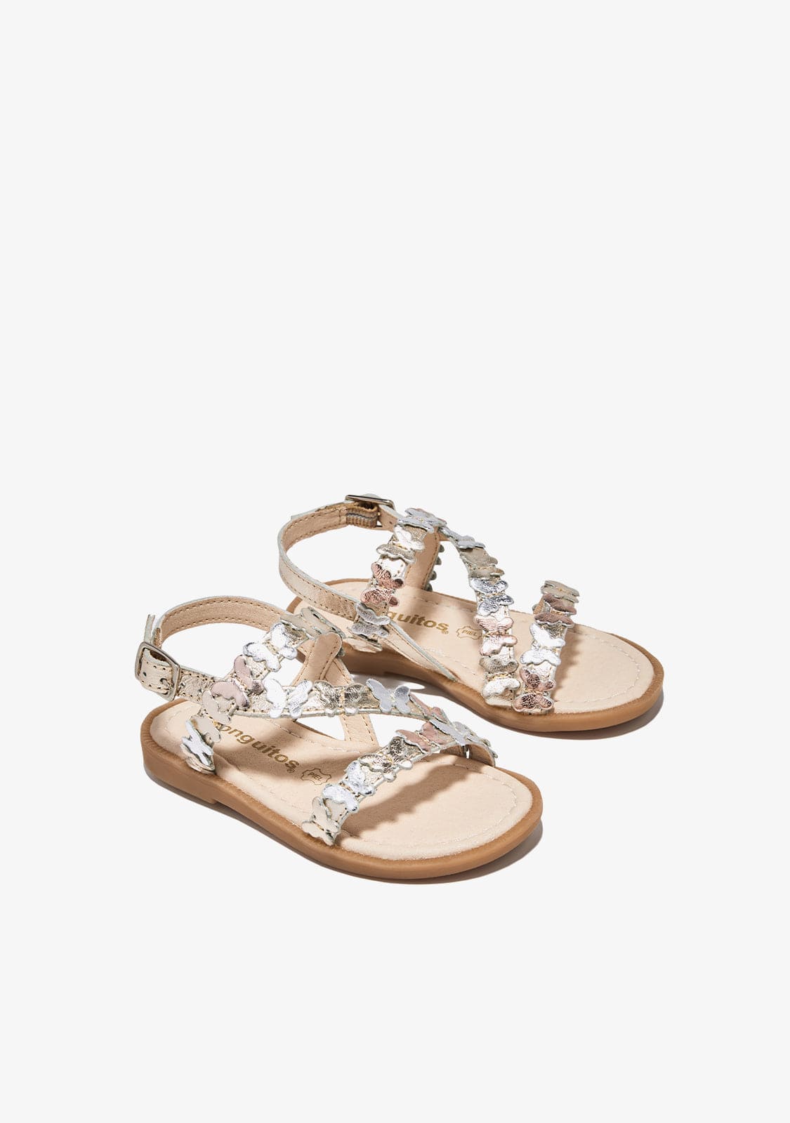 This model of silver sandals is designed in nappa leather. It has a strap with a metal buckle fastening. The straps are decorated with butterflies in different shades.