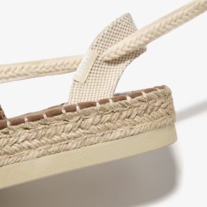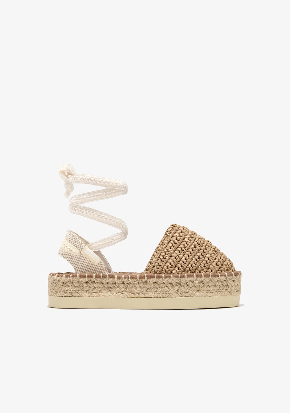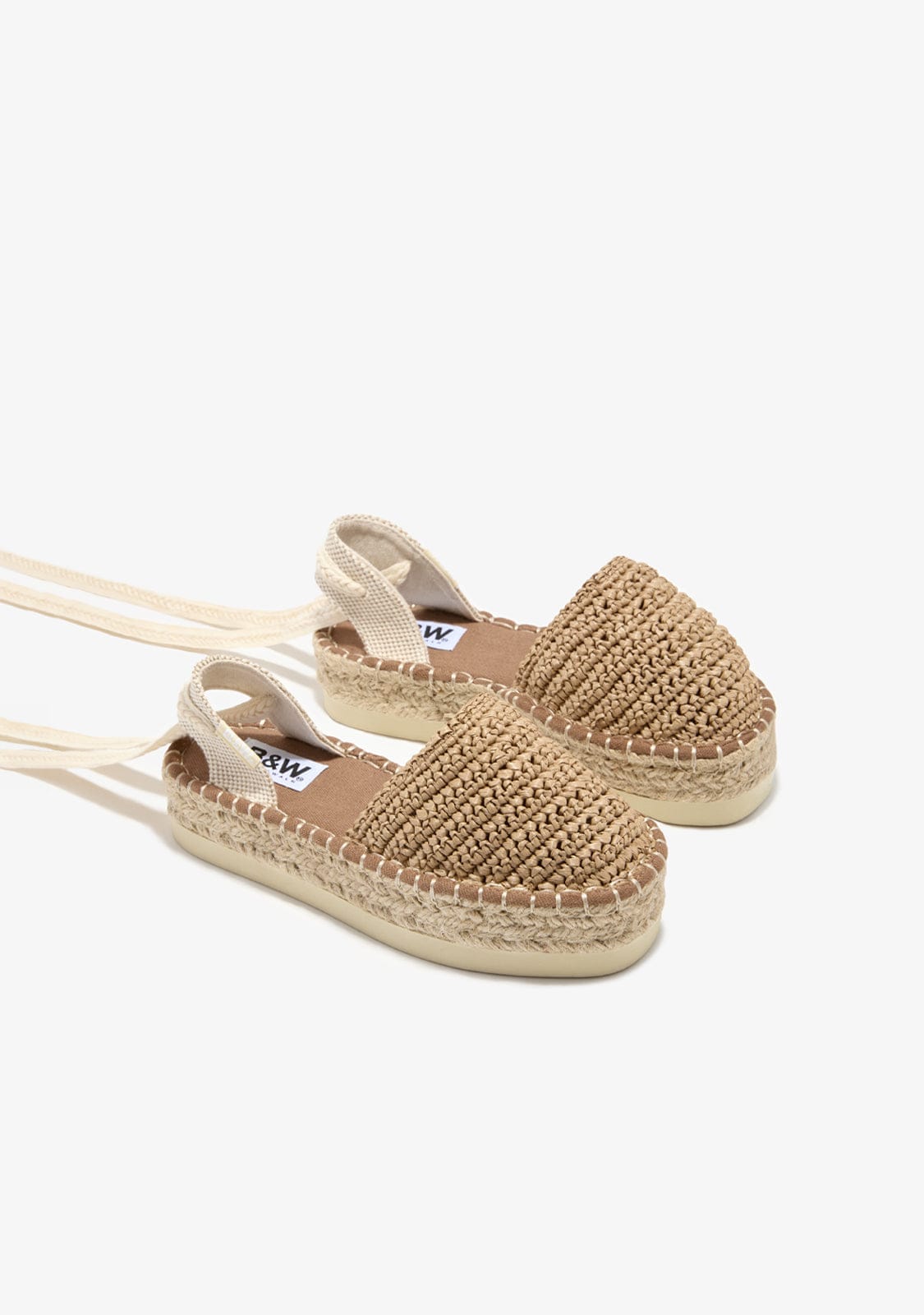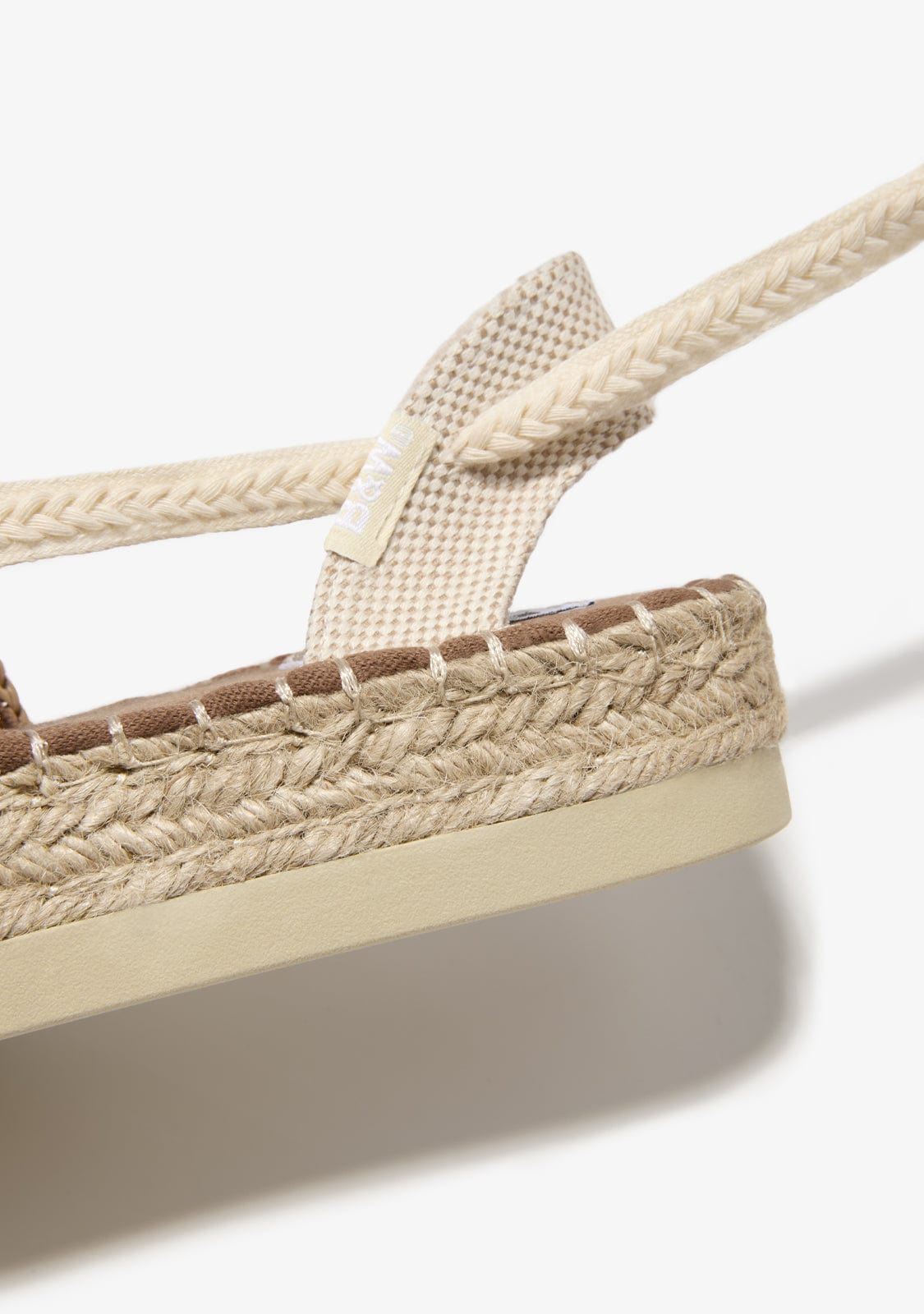 These espadrilles in brown are made of jute and synthetic raffia. They have a closed toe and jute braiding. They are tied to the leg with braided ribbons that give a special touch to the footwear.