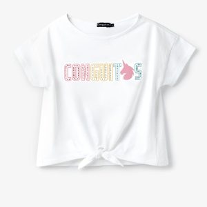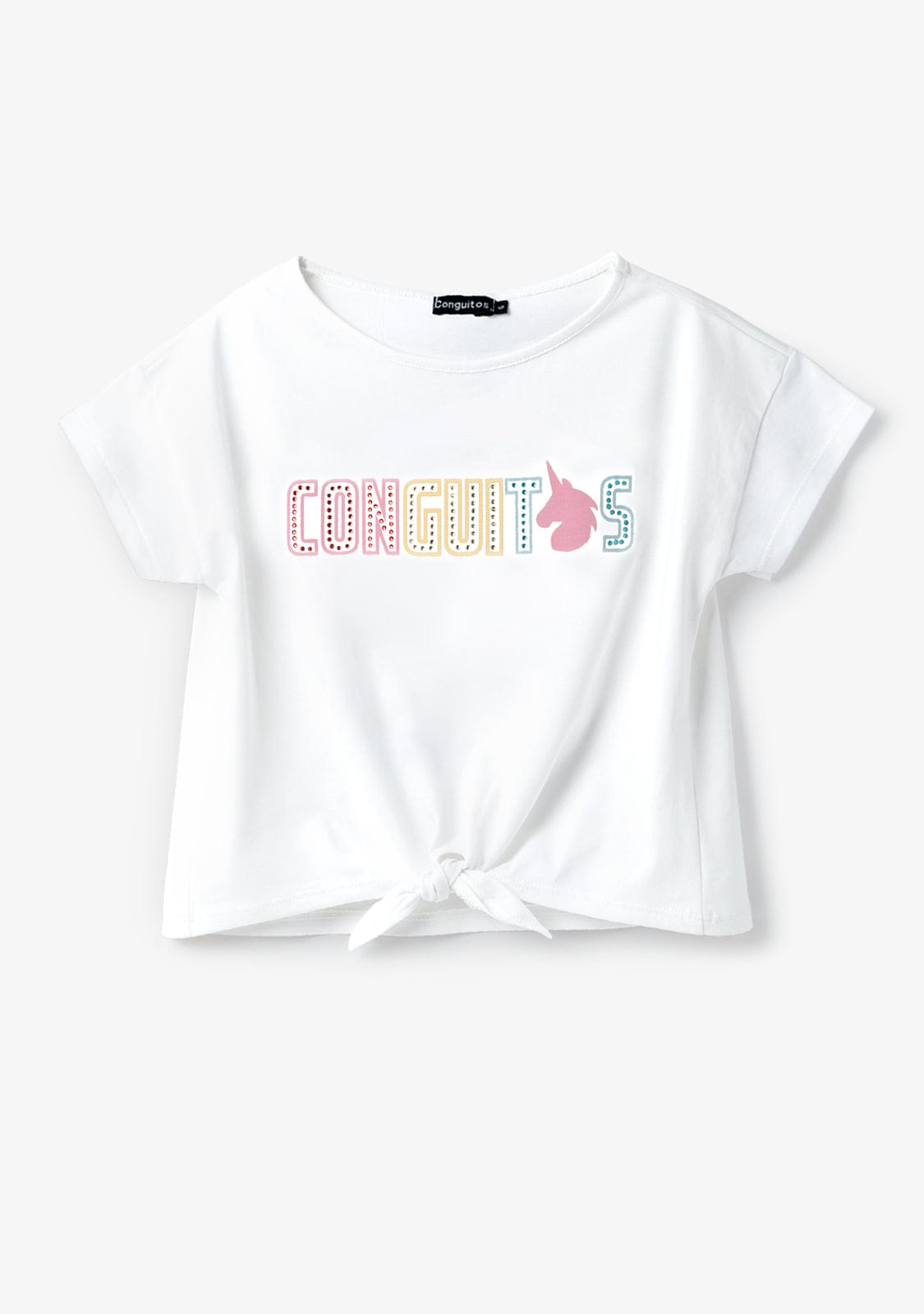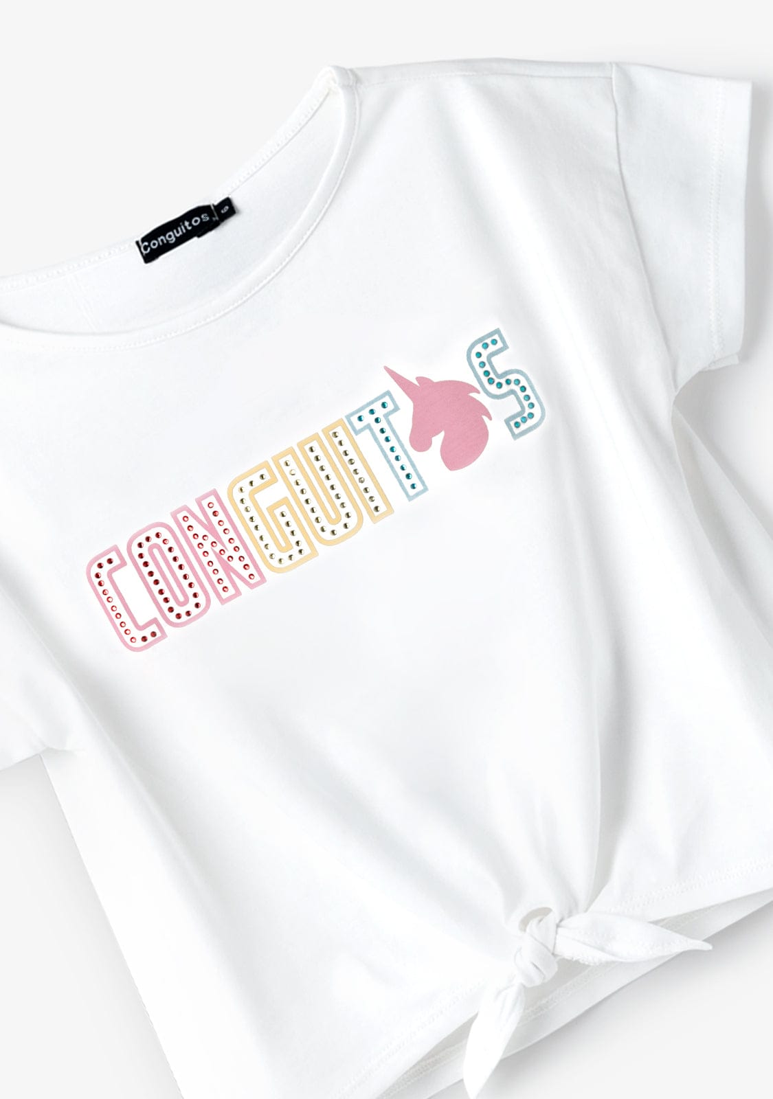 This white short-sleeved T-shirt with a round neck is perfect for making hot days more fun. It has the Conguitos emblem printed with coloured strass and a pink unicorn.