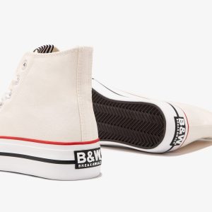 These trainers combine white canvas with details in red and black.  They have rubber reinforcement on the toe for extra strength. They feature the B&W logo on the upper and heel.They also have a rubber sole and a textile insole.