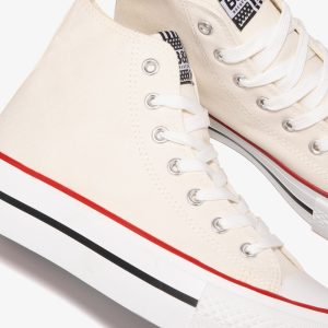 White canvas high top trainers, a classic that never goes out of fashion.