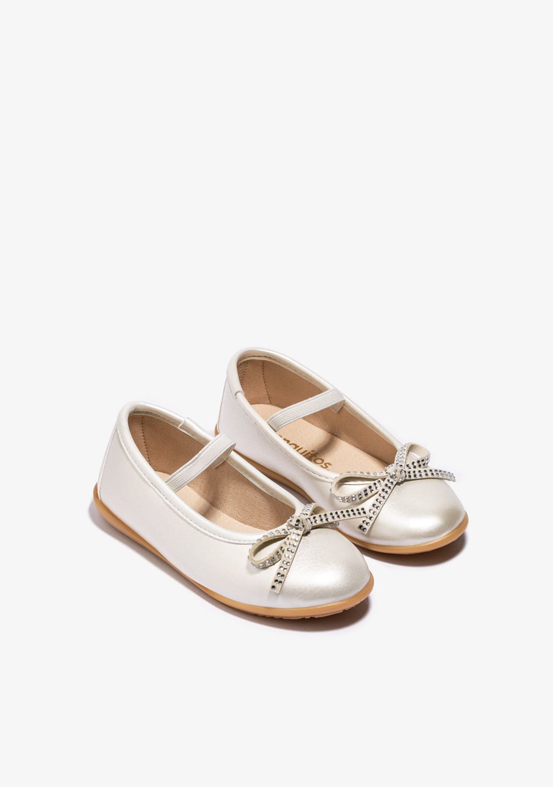 A comfortable and elegant basic, perfect for the little ones’ events, this model is decorated with a silver glitter bow and a white trim on the edge. It has an elasticated strap on the instep for better foot support.