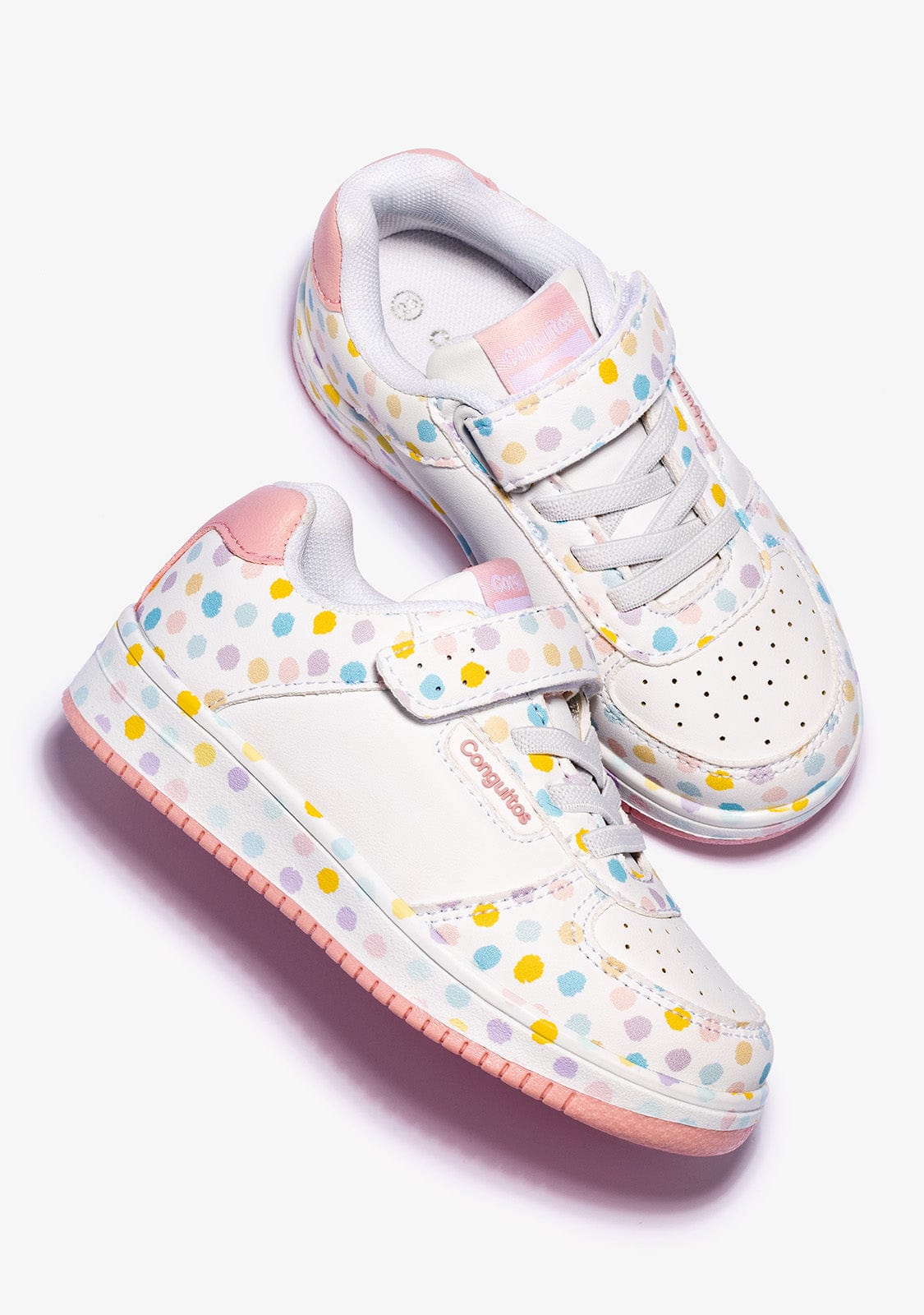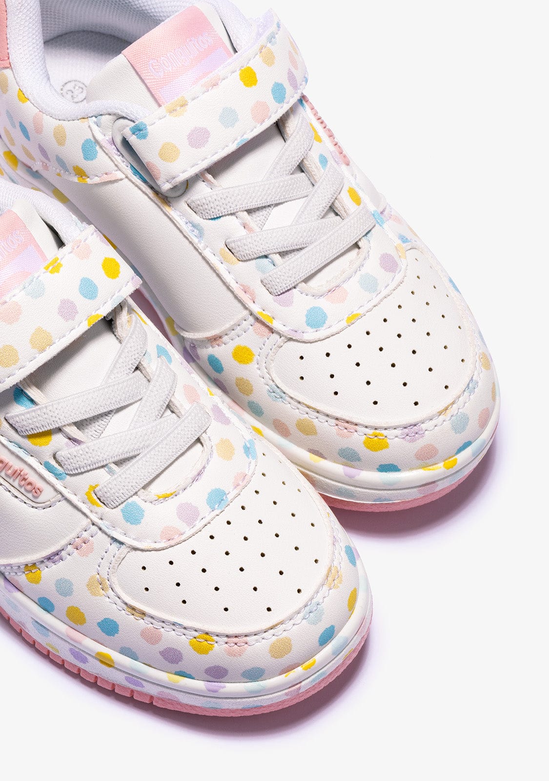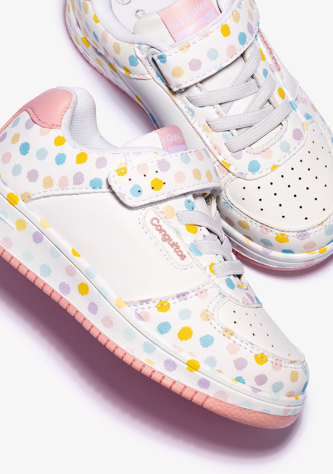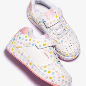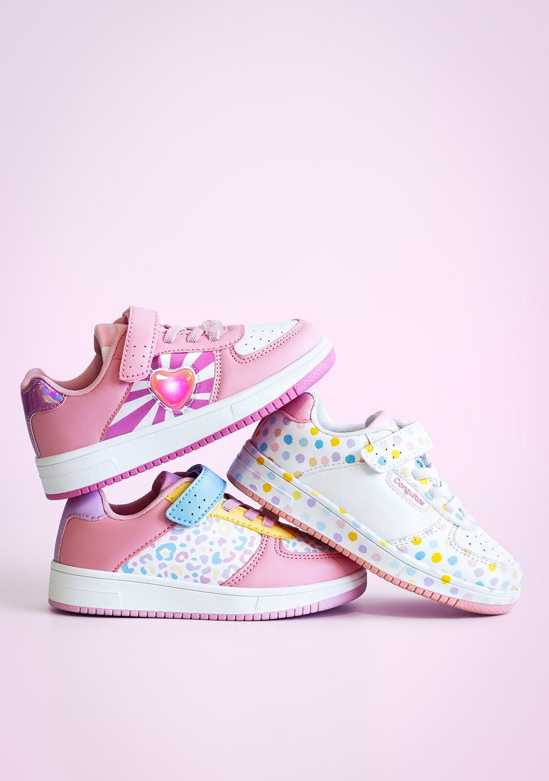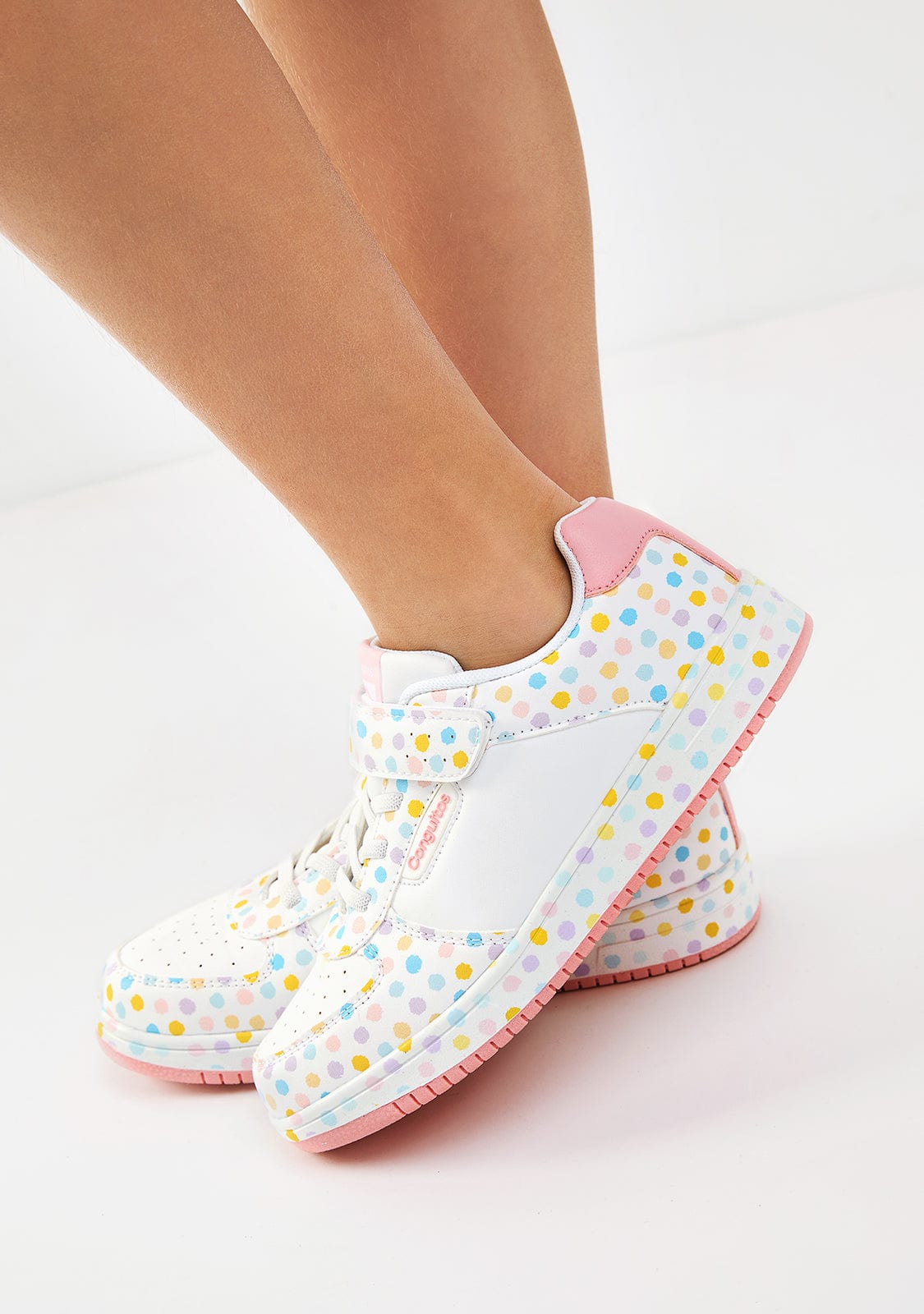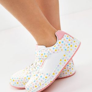 This micro-layer design combines white and pink with multicoloured dots. It has an easy slip-on strap and decorative elasticated laces.