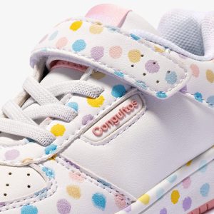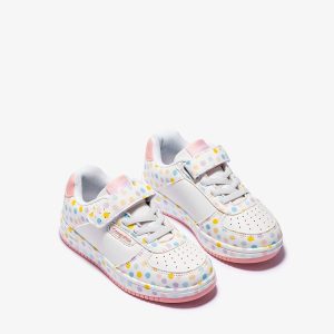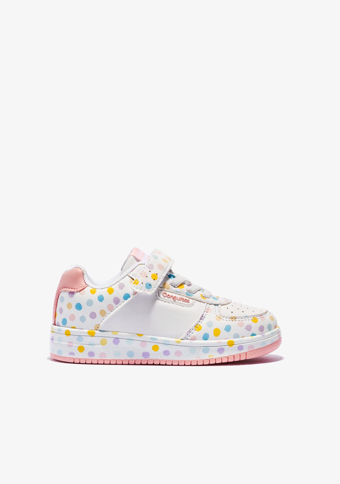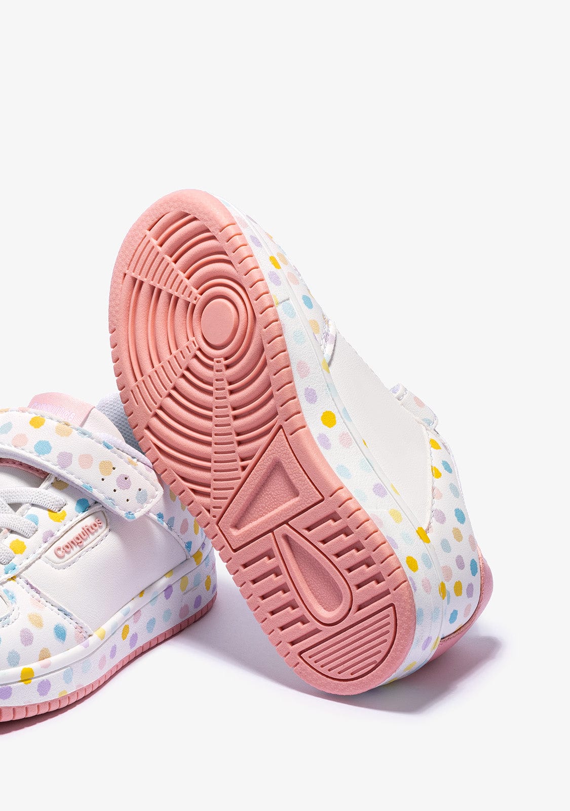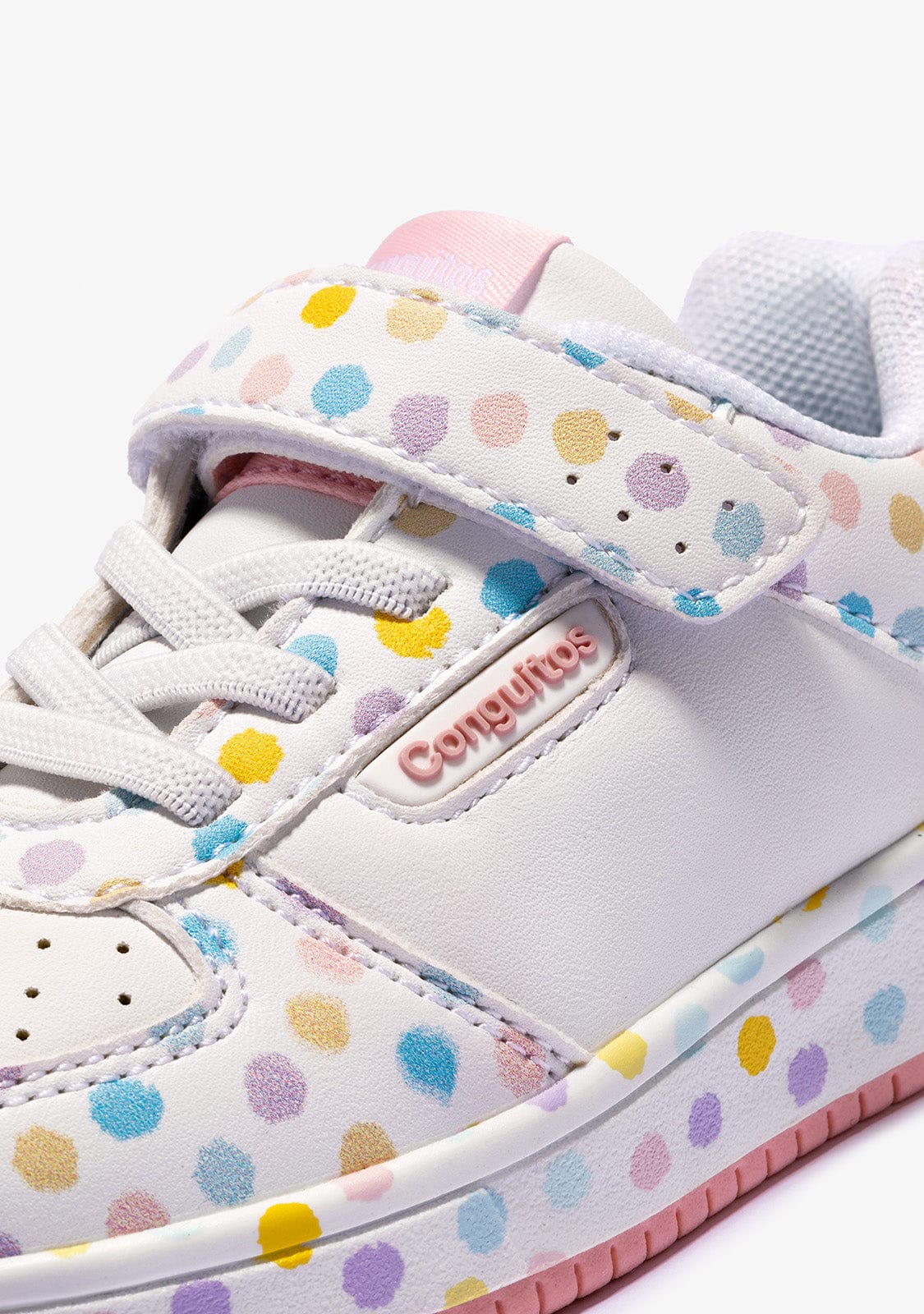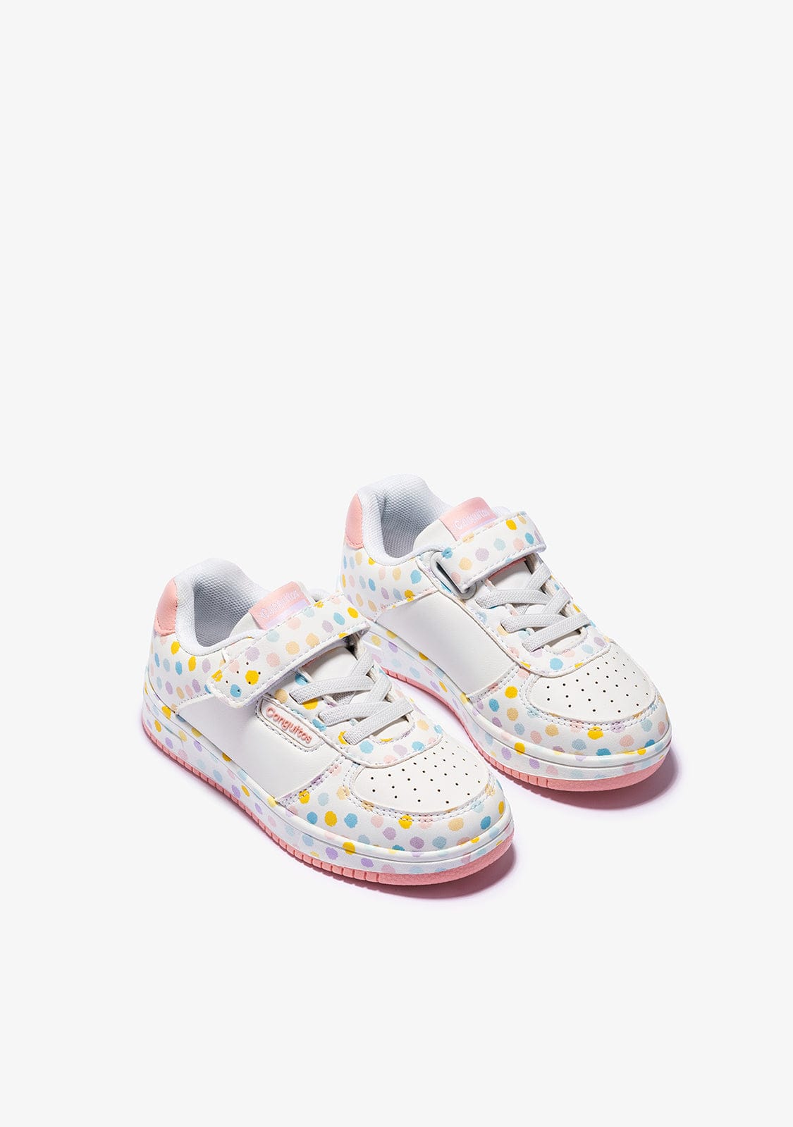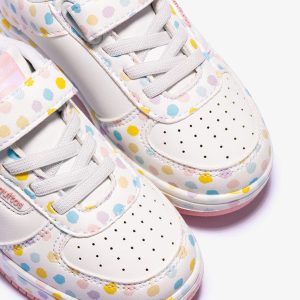 This micro-layer design combines white and pink with multicoloured dots. It has an easy slip-on strap and decorative elasticated laces.
