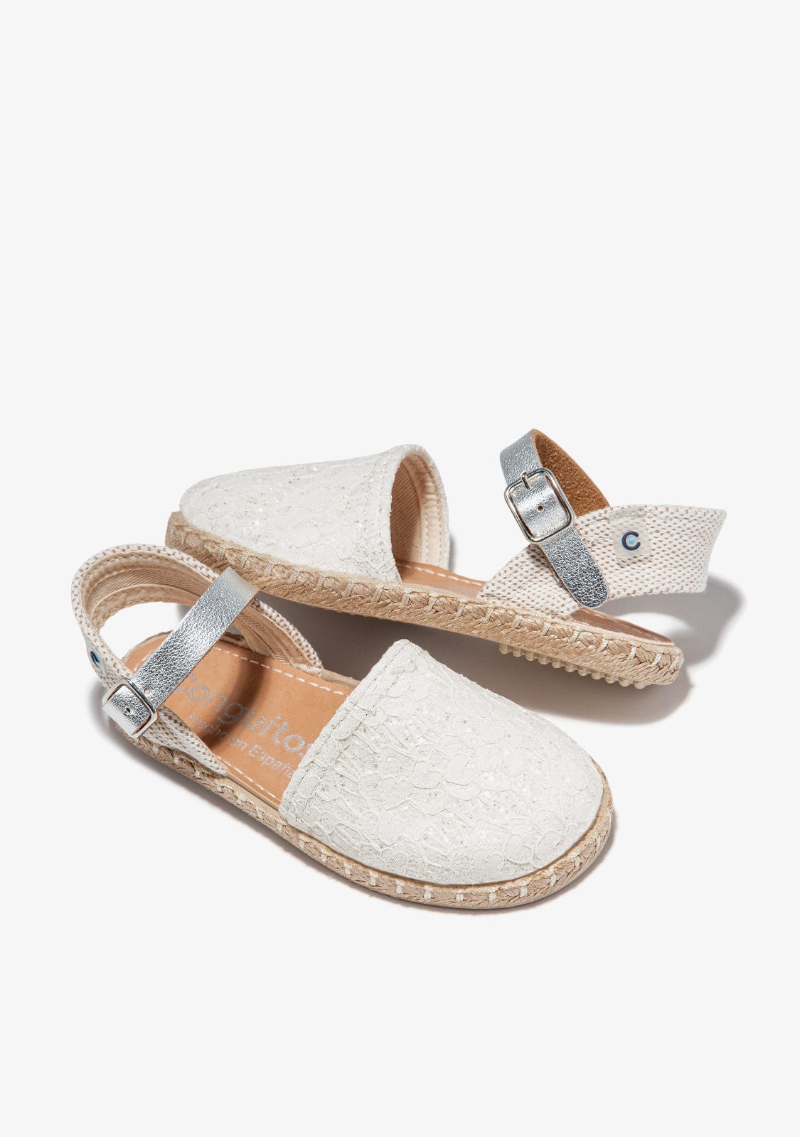White espadrilles with brown and silver details. The front part is closed and embroidered with floral motifs. They have a buckle fastening for a better fastening to the foot and a silver plated bracelet that gives them a special touch. It has the Conguitos logo on the back.