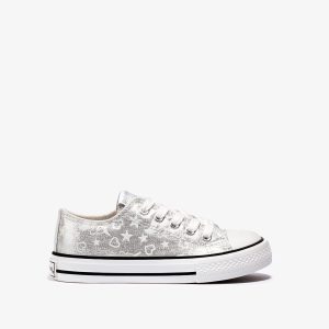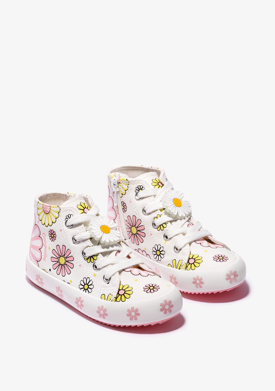 The canvas trainers feature adjustable laces with a glow-in-the-dark daisy appliqué. They also have a zip on the inside side for easy on and off.