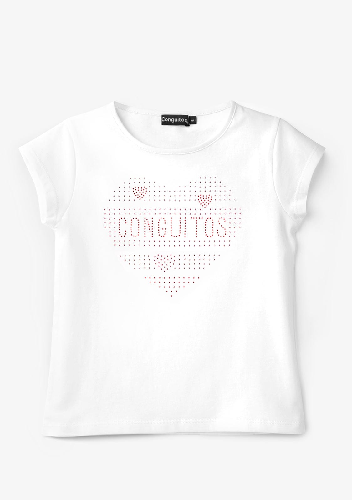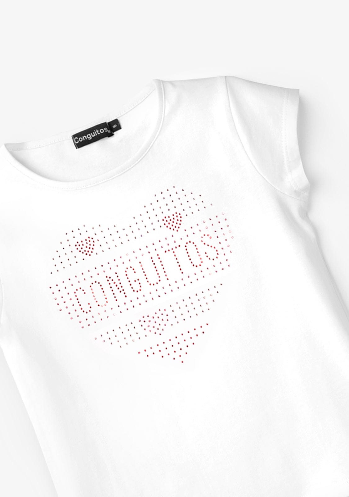 This model has short sleeves and a round neck. It has a fun glitter print in the shape of a red heart.