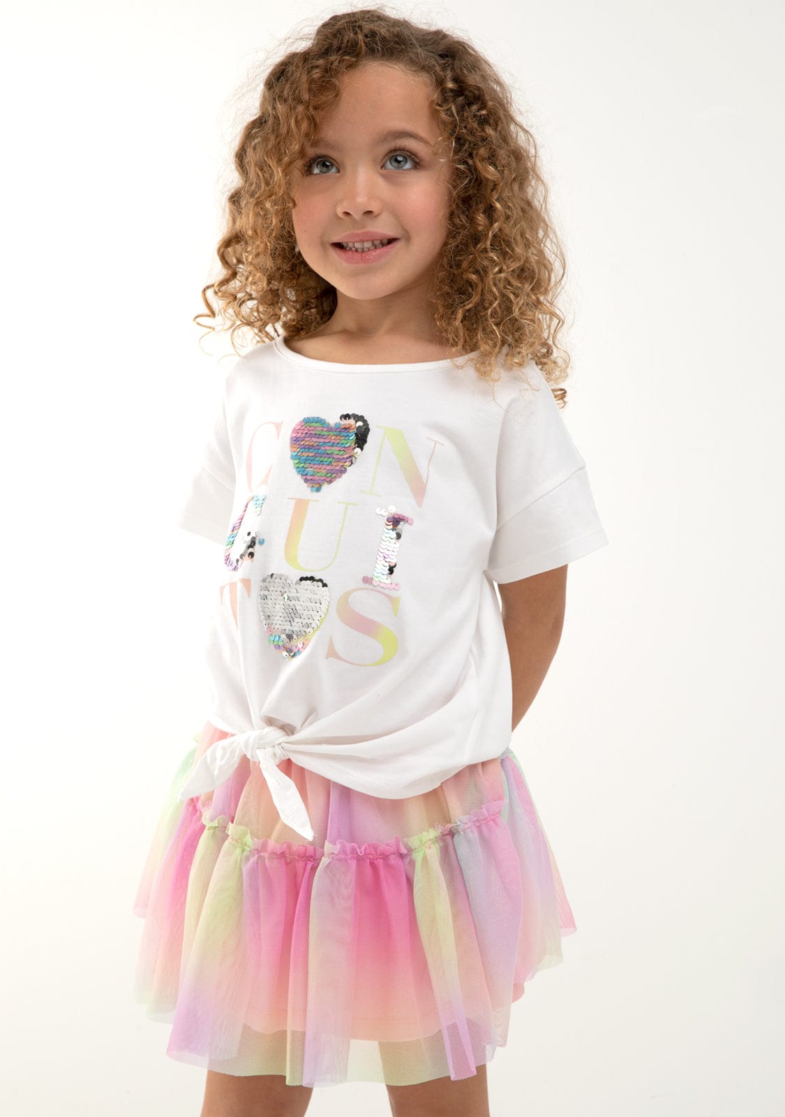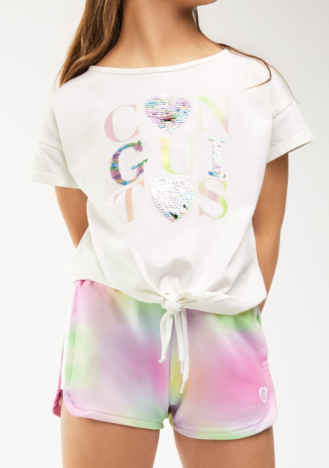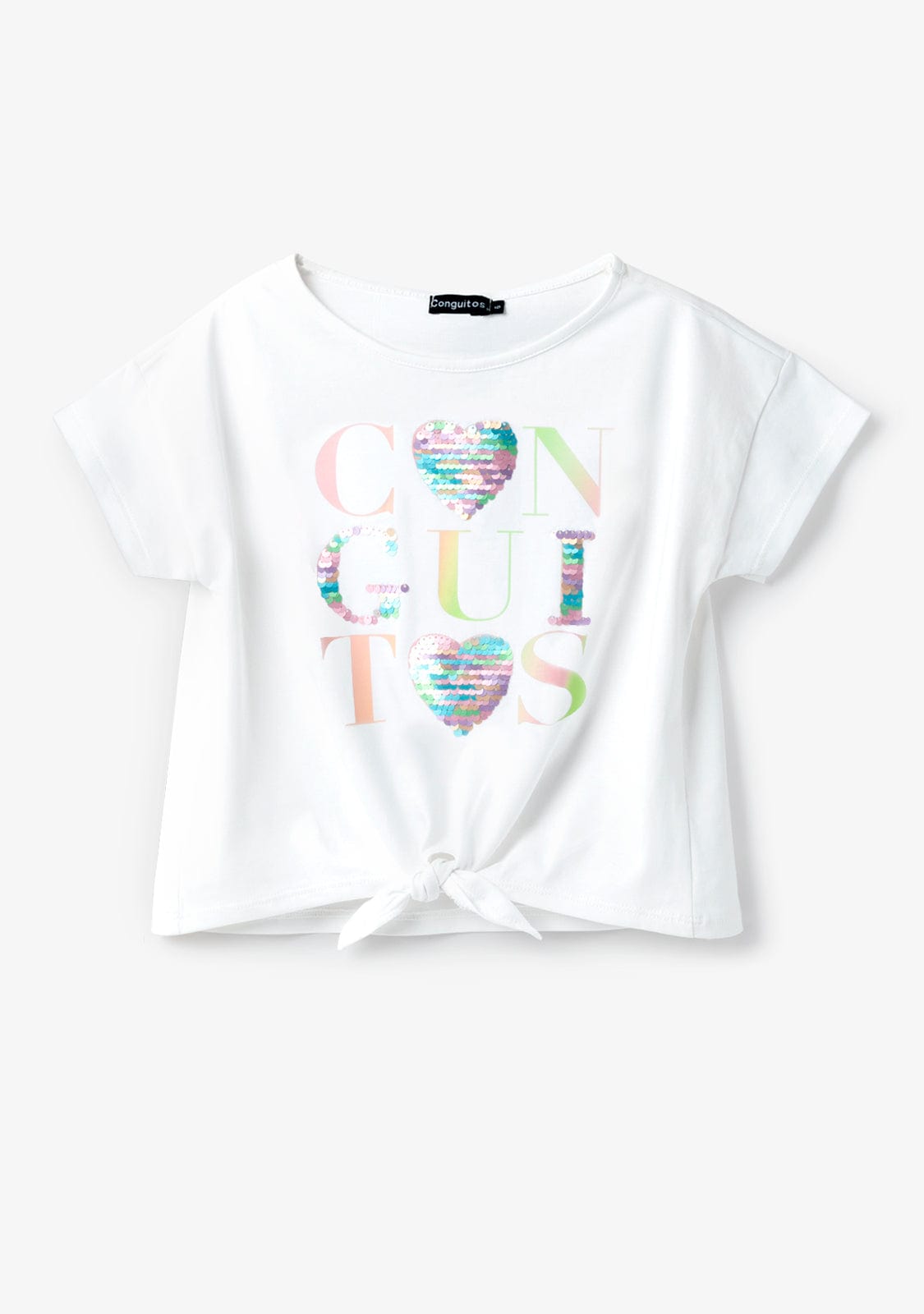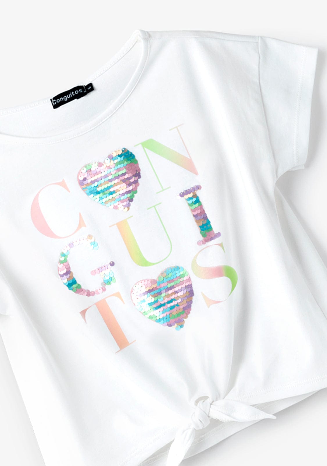 This white short-sleeved T-shirt with round neck is perfect to make hot days more fun. It is printed with the conguitos emblem with sequined hearts. It is hemmed at the sleeves and has a knot at the hem that gives a special touch to a basic.